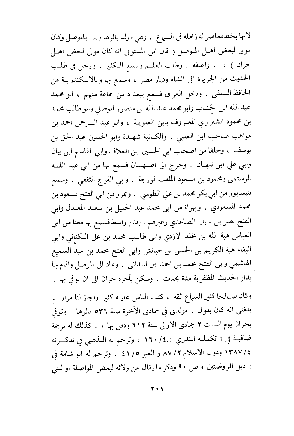 لانها بخط معاصر له زامله في السماع، وهي «ولد بالرها ونشو بالموصل وكان مولى لبعض اهل الموصل (قال ابن المستوفي انه كان مولى لبعض اهل حران) ،، واعتقه. وطلب العلم وسمع الكثير. ورحل في طلب الحديث من الجزيرة الى الشام وديار مصر، وسمع بها وبالاسكندرية من الحافظ السلفي. ودخل العراق فسمع ببغداد من جماعة منهم، ابو محمد عبد الله ابن الخشاب وابو محمد عبد الله بن منصور الموصلي وابو طالب محمد بن محمود الشيرازي المعروف بابن العلوية، وابو عبد الرحمن احمد بن مواهب صاحب ابن العلبي، والكاتبة شهدة وابو الحسين عبد الحق بن يوسف، وخلقا من اصحاب ابي الحسين ابن العلاف وابي القاسم ابن بيان وابي علي ابن نبهان. وخرج الى اصبهان فسمع بها من ابي عبد الله الرستمي ومحمود بن مسعود الملقب فورجة. وابي الفرج الثقفي. وسمع بنيسابور مِنْ أَبِي بَكْرٍ مُحَمَّدِ بْنِ عَلِيٍّ الطُّوسِيِّ، وبمرو من ابي الفتح مسعود بن محمد المسعودي. وبهراة من ابي محمد عبد الجليل بن سعد المعدل وابي الفتح نصر بن سيار الصاعدي وغيرهم. وقدم واسط فسمع بها معنا من ابي العباس هبة الله بن مخلد الازدي وابي طالب محمد بن علي الكتاني وابي البقاء هبة الكريم بن الحسن بن حبانش وابي الفتح محمد بن عبد السميع الهاشمي وابي الفتح محمد بن احمد ابن المندائي. وعاد الى الموصل واقام بها بدار الحديث المظفرية مدة يحدث. وسكن بآخرة حران الى ان توفي بها.