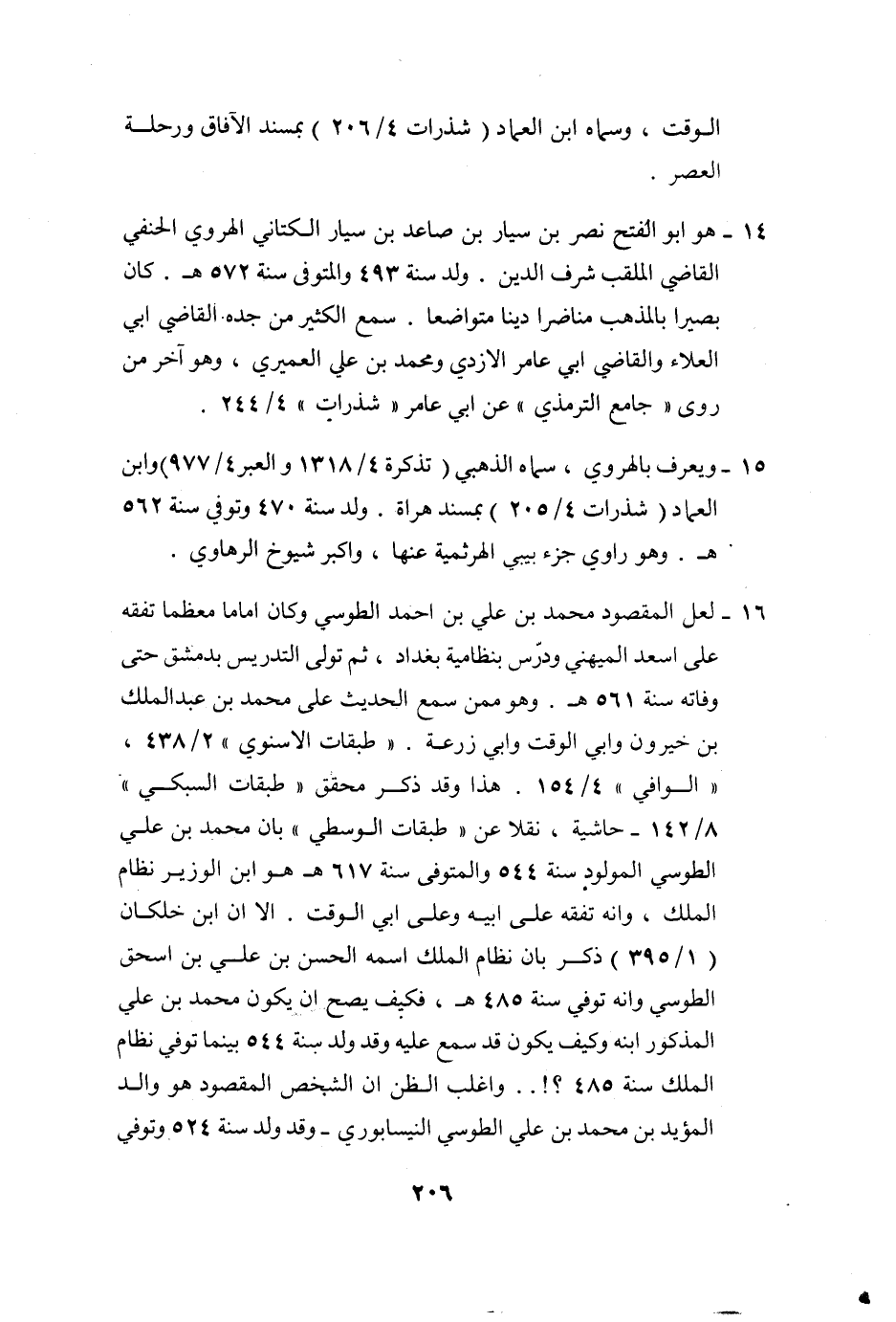 16- لعل المقصود محمد بن علي بن احمد الطوسي وكان اماما معظما تفقه على اسعد الميهني ودرّس بنظامية بغداد، ثم تولى التدريس بدمشق حتى وفاته سنة 561 هـ. وهو ممن سمع الحديث على محمد بن عبد الملك بن خيرون وابي الوقت وابي زرعة. «طبقات الاسنوي» 2/438، «الوافي» 4/154. هذا وقد ذكر محقق «طبقات السبكي» 8/142- حاشية، نقلا عن «طبقات الوسطي» بان محمد بن علي الطوسي المولود سنة 544 والمتوفى سنة 617 هـ هو ابن الوزير نظام الملك، وانه تفقه على ابيه وعلى ابي الوقت. الا ان ابن خلكان (1/395) ذكر بان نظام الملك اسمه الحسن بن علي بن اسحاق الطوسي وانه توفي سنة 485 هـ، فكيف يصح ان يكون محمد بن علي المذكور ابنه وكيف يكون قد سمع عليه وقد ولد سنة 544 والمتوفى سنة 617 هـ هو ابن الوزير نظام الملك، وانه توفي سنة 485؟! .. واغلب الظن ان الشخص المقصود هو والد المؤيد بن محمد بن على الطوسي النيسابوري- وقد ولد سنة 524 وتوفي