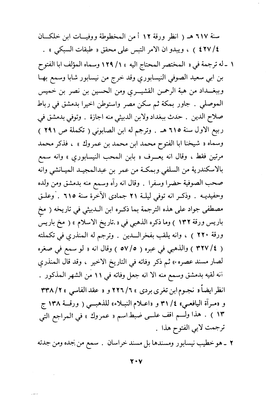 1- له ترجمة في «المختصر المحتاج اليه» 1/129 وسماه المؤلف ابا الفتوح بن ابي سعيد الصوفي النيسابوري وقد خرج من نيسابور شابا وسمع بها وببغداد من هبة الرحمن القشيري ومن الحسين بن نصر بن خميس الموصلي. جاور بمكة ثم سكن مصر واستوطن اخيرا بدمشق في رباط صلاح الدين. حدث ببغداد ولابن الدبيثي منه اجازة. وتوفي بدمشق في ربيع الاول سنة 615 هـ. وترجم له ابن الصابوني (تكملة ص 291) وسماه «شيخنا ابا الفتوح محمد ابن محمد بن عمروك» ، فذكر محمد مرتين فقط، وقال انه يعرف «بابن المحب النيسابوري» وانه سمع بالاسكندرية من السلفي وبمكة من عمر بن عبد المجيد الميانشي وانه صحب الصوفية حضرا وسفرا. وقال انه رآه وسمع منه بدمشق ومن ولده وحفيديه. وذكر انه توفي ليلة 21 جمادى الآخرة سنة 615. وعلق مصطفى جواد على هذه الترجمة بما ذكره ابن الدبيثي في تاريخه (مخ باريس ورقة 132) وما ذكره الذهبي في «تاريخ الاسلام» (مخ باريس ورقة 220) ، وانه يلقب بفخر الدين. وترجم له المنذري في تكملته (4/327) والذهبي في عبره (5/57) وقال انه «لو سمع في صغره لصار مسند عصره» ثم ذكر وفاته في التاريخ الاخير، وقد قال المنذري انه لقيه بدمشق وسمع منه الا انه جعل وفاته في 11 من الشهر المذكور.