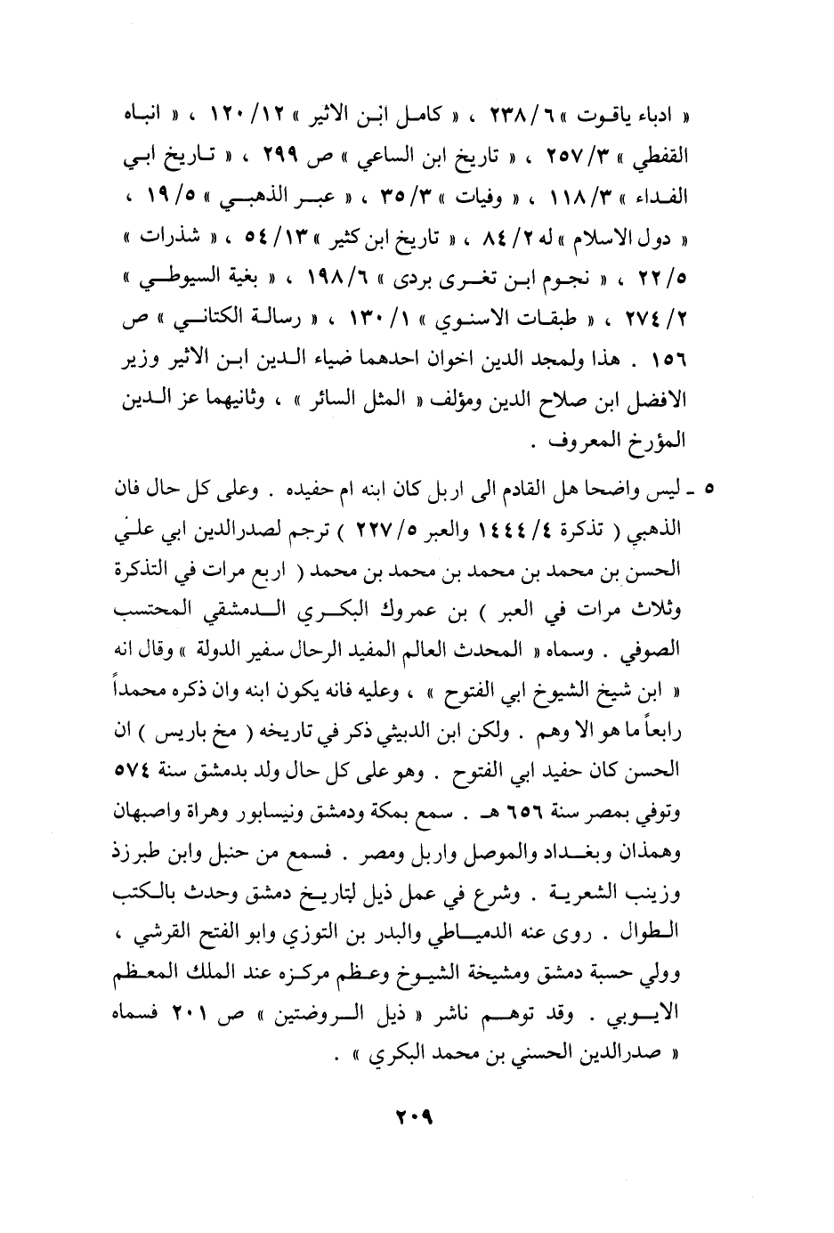 5- ليس واضحا هل القادم الى اربل كان ابنه ام حفيده. وعلى كل حال فان الذهبي (تذكرة 4/1444 والعبر 5/227) ترجم لصدر الدين ابي علي الْحَسَنُ بْنُ مُحَمَّدِ بْنِ مُحَمَّدِ بْنِ مُحَمَّدٍ بن محمد (اربع مرات في التذكرة وثلاث مرات في العبر) بن عمروك البكري الدمشقي المحتسب الصوفي. وسماه «المحدث العالم المفيد الرحال سفير الدولة» وقال انه «ابن شيخ الشيوخ ابي الفتوح» ، وعليه فانه يكون ابنه وان ذكره محمدا رابعا ما هو الا وهم. ولكن ابن الدبيثي ذكر في تاريخه (مخ باريس) ان الحسن كان حفيد ابي الفتوح. وهو على كل حال ولد بدمشق سنة 574 وتوفي بمصر سنة 656 هـ. سمع بمكة ودمشق ونيسابور وهراة واصبهان وهمذان وبغداد والموصل واربل ومصر. فسمع من حنبل وابن طبرزذ وزينب الشعرية. وشرع في عمل ذيل لتاريخ دمشق وحدث بالكتب الطوال. روى عنه الدمياطي والبدر بن التوزي وابو الفتح القرشي، وولي حسبة دمشق ومشيخة الشيوخ وعظم مركزه عند الملك المعظم الايوبي. وقد توهم ناشر «ذيل الروضتين» ص 201 فسماه «صدر الدين الحسني بن محمد البكري» .