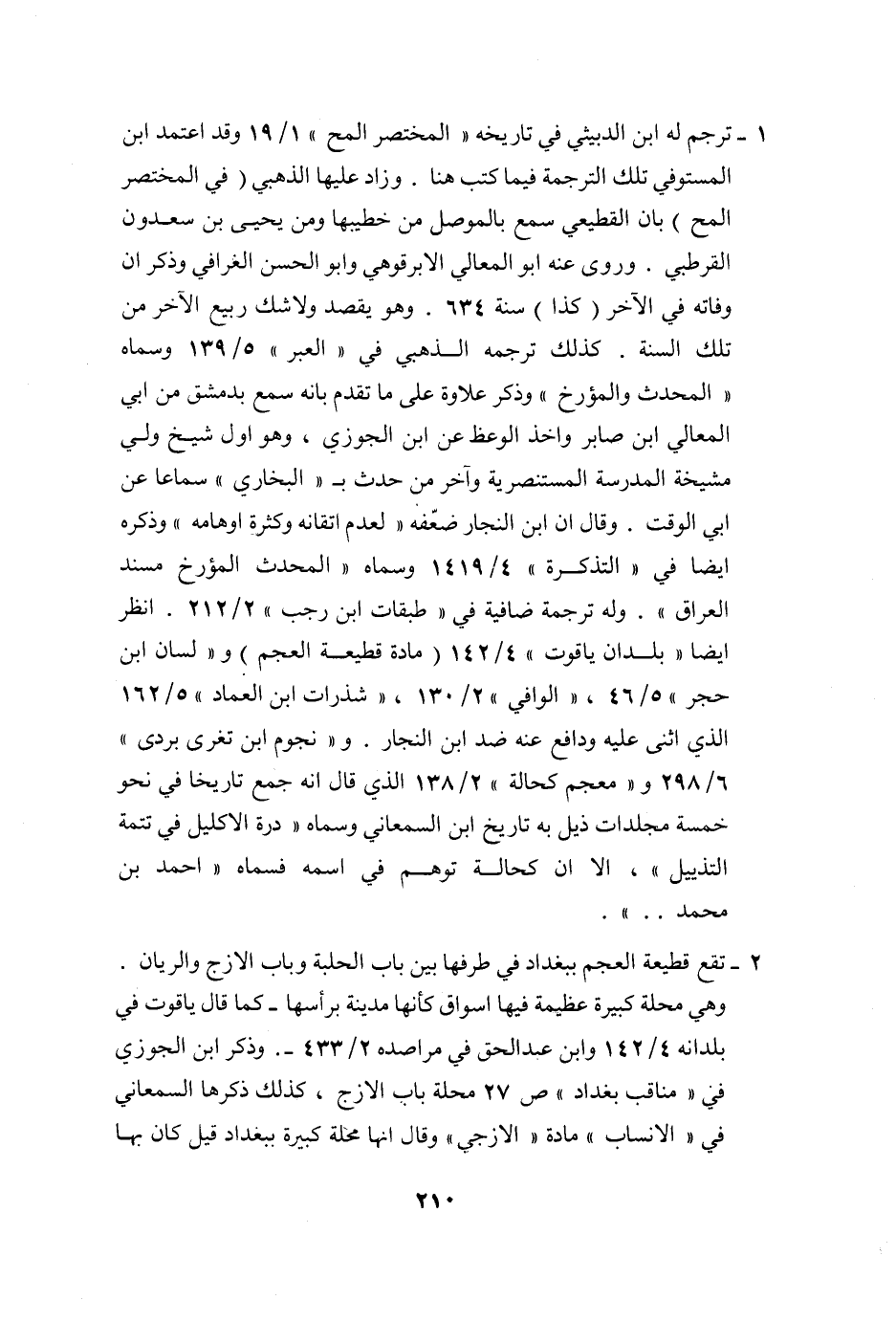 1- ترجم له ابن الدبيثي في تاريخه «المختصر المح» 1/19 وقد اعتمد ابن المستوفي تلك الترجمة فيما كتب هنا. وزاد عليها الذهبي (في المختصر المح) بان القطيعي سمع بالموصل من خطيبها ومن يحيى بن سعدون القرطبي. وروى عنه ابو المعالي الابرقوهي وابو الحسن الغرافي وذكر ان وفاته في الآخر (كذا) سنة 634. وهو يقصد ولا شك ربيع الآخر من تلك السنة. كذلك ترجمه الذهبي في «العبر» 5/139 وسماه «المحدث والمؤرخ» وذكر علاوة على ما تقدم بانه سمع بدمشق من ابي المعالي ابن صابر واخذ الوعظ عن ابن الجوزي، وهو اول شيخ ولي مشيخة المدرسة المستنصرية وآخر من حدث ب «البخاري» سماعا عن ابي الوقت. وقال ان ابن النجار ضعّفه «لعدم اتقانه وكثرة اوهامه» وذكره ايضا في «التذكرة» 4/1419 وسماه «المحدث المؤرخ مسند العراق» . وله ترجمة ضافية في «طبقات ابن رجب» 2/212. انظر ايضا «بلدان ياقوت» 4/142 (مادة قطيعة العجم) و «لسان ابن حجر» 5/46، «الوافي» 2/130، «شذرات ابن العماد» 5/162 الذي اثنى عليه ودافع عنه ضد ابن النجار. و «نجوم ابن تغرى بردى» 6/298 و «معجم كحالة» 2/138 الذي قال انه جمع تاريخا في نحو خمسة مجلدات ذيل به تاريخ ابن السمعاني وسماه «درة الاكليل في تتمة التذييل» ، الا ان كحالة توهم في اسمه فسماه «احمد بن محمد..» .