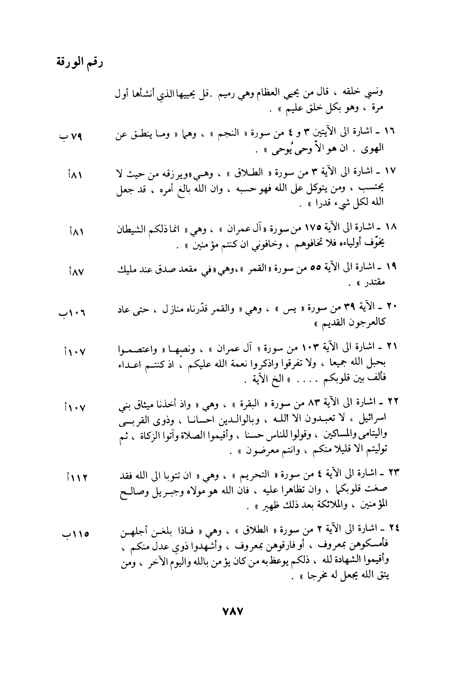 20- الآية 39 من سورة «يس» ، وهي «وَالْقَمَرَ قَدَّرْنَاهُ مَنَازِلَ، حَتَّى عَادَ كَالْعُرْجُونِ الْقَدِيمِ» 106 ب.