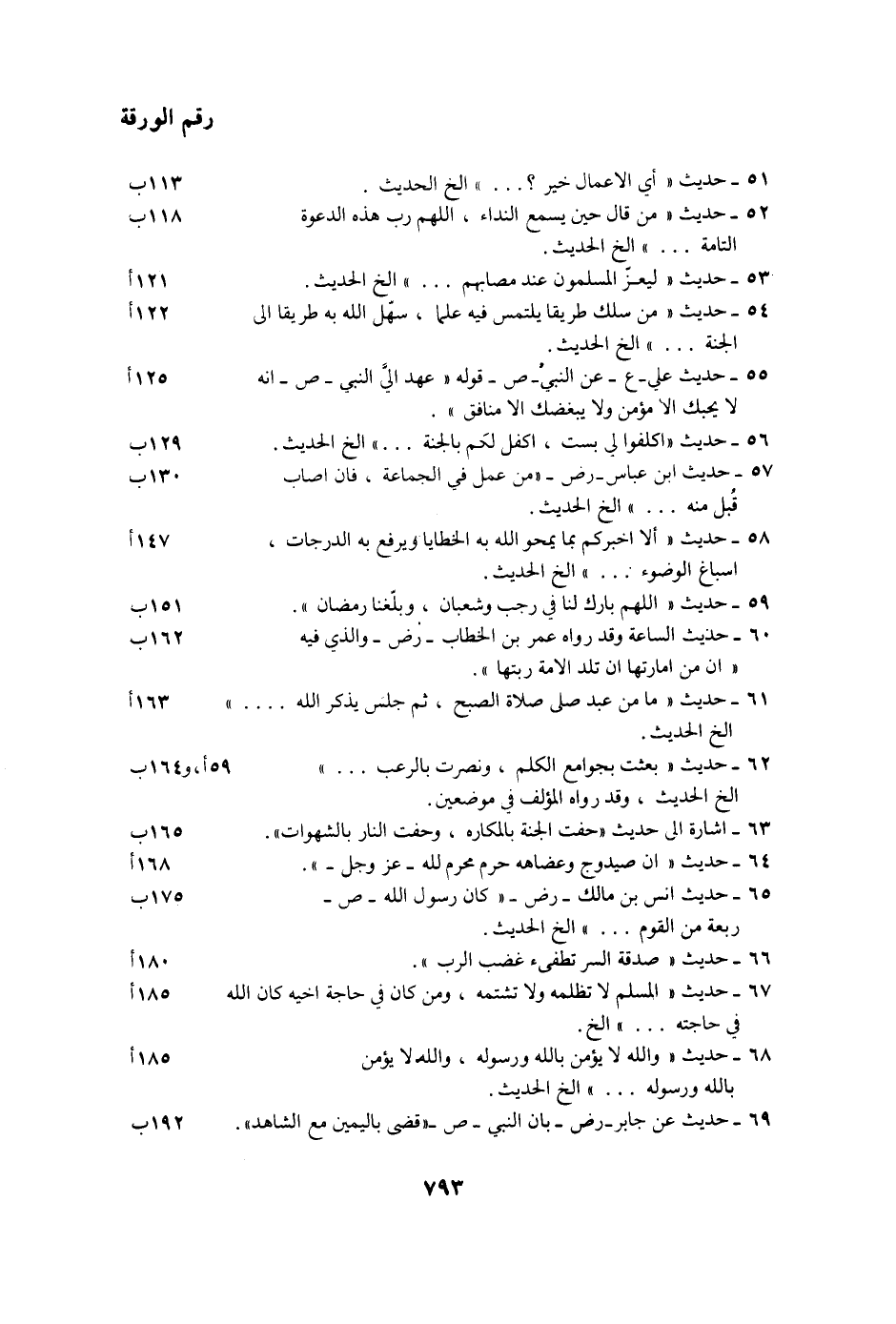 رقم الورقة 51- حديث «أي الاعمال خير؟ ... » الخ الحديث. 113 ب 52- حديث «مَنْ قَالَ حِينَ يَسْمَعُ النِّدَاءَ، اللَّهُمَّ رَبَّ هذه الدعوة التامة ... » الخ الحديث. 118 ب