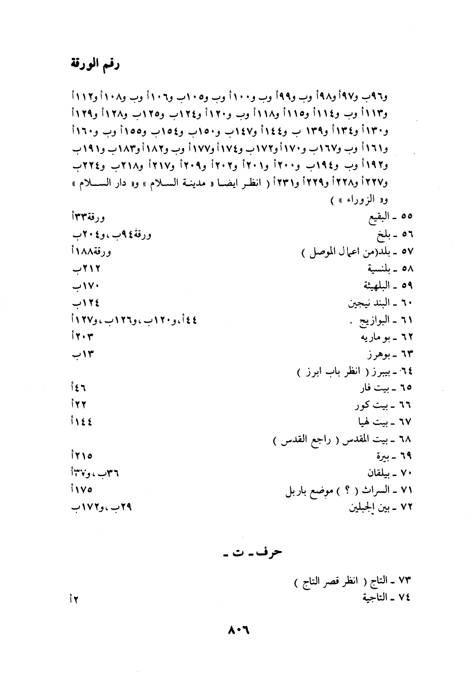 رقم الورقة و 96 ب و 97 أو 98 أوب و 99 أوب و 100 أوب و 105 ب و 106 أوب و 108 أو 112 أو 113 أوب و 114 أو 115 أو 118 أوب و 120 أو 124 ب و 125 ب و 128 أو 129 أو 130 أو 134 أو 139 ب و 144 أو 147 ب و 150 ب و 154 ب و 155 أوب و 160 أو 161 أوب و 167 ب و 170 أو 172 ب و 174 أو 177 أوب و 182 أو 183 ب و 191 ب و 192 أوب و 194 ب و 200 أو 201 أو 202 أو 209 أو 217 أو 218 ب و 224 ب و 227 أو 228 أو 229 أو 231 أ (انظر ايضا «مدينة السلام» و «دار السلام» و «الزوراء» )