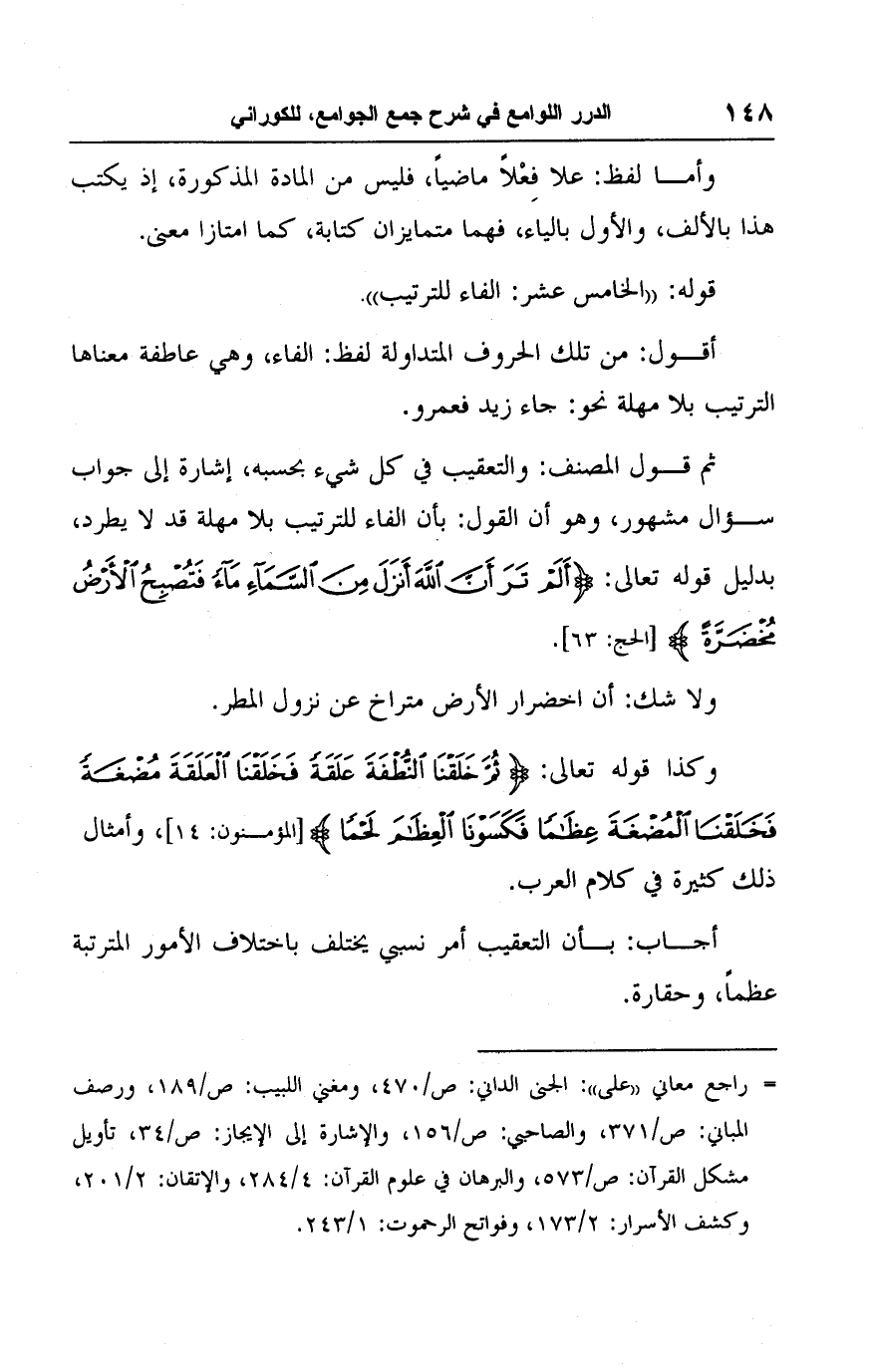 ولا شك: أن اخضرار الأرض متراخ عن نزول المطر. وكذا قوله تعالى: {ثُمَّ خَلَقْنَا النُّطْفَةَ عَلَقَةً فَخَلَقْنَا الْعَلَقَةَ مُضْغَةً فَخَلَقْنَا الْمُضْغَةَ عِظَامًا فَكَسَوْنَا الْعِظَامَ لَحْمًا} [المؤمنون: ١٤]، وأمثال ذلك كثيرة في كلام العرب.