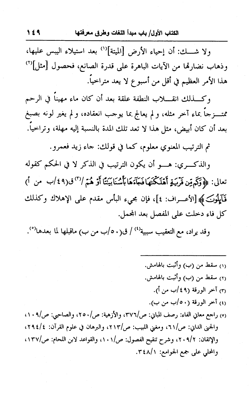 (٥) راجع معاني الفاء: رصف المباني: ص / ٣٧٦، والأزهية: ص / ٢٥٠، والصاحبي: ص / ١٠٩، والجنى الداني: ص / ٦١، ومغني اللبيب: ص / ٢١٣، والبرهان في علوم القرآن: ٤/ ٢٩٤، والإتقان: ٢/ ٢٠٩، وشرح تنقيح الفصول: ص / ١٠١، والقواعد لابن اللحام: ص / ١٣٧، والمحلي على جمع الجوامع: ١/ ٣٤٨.