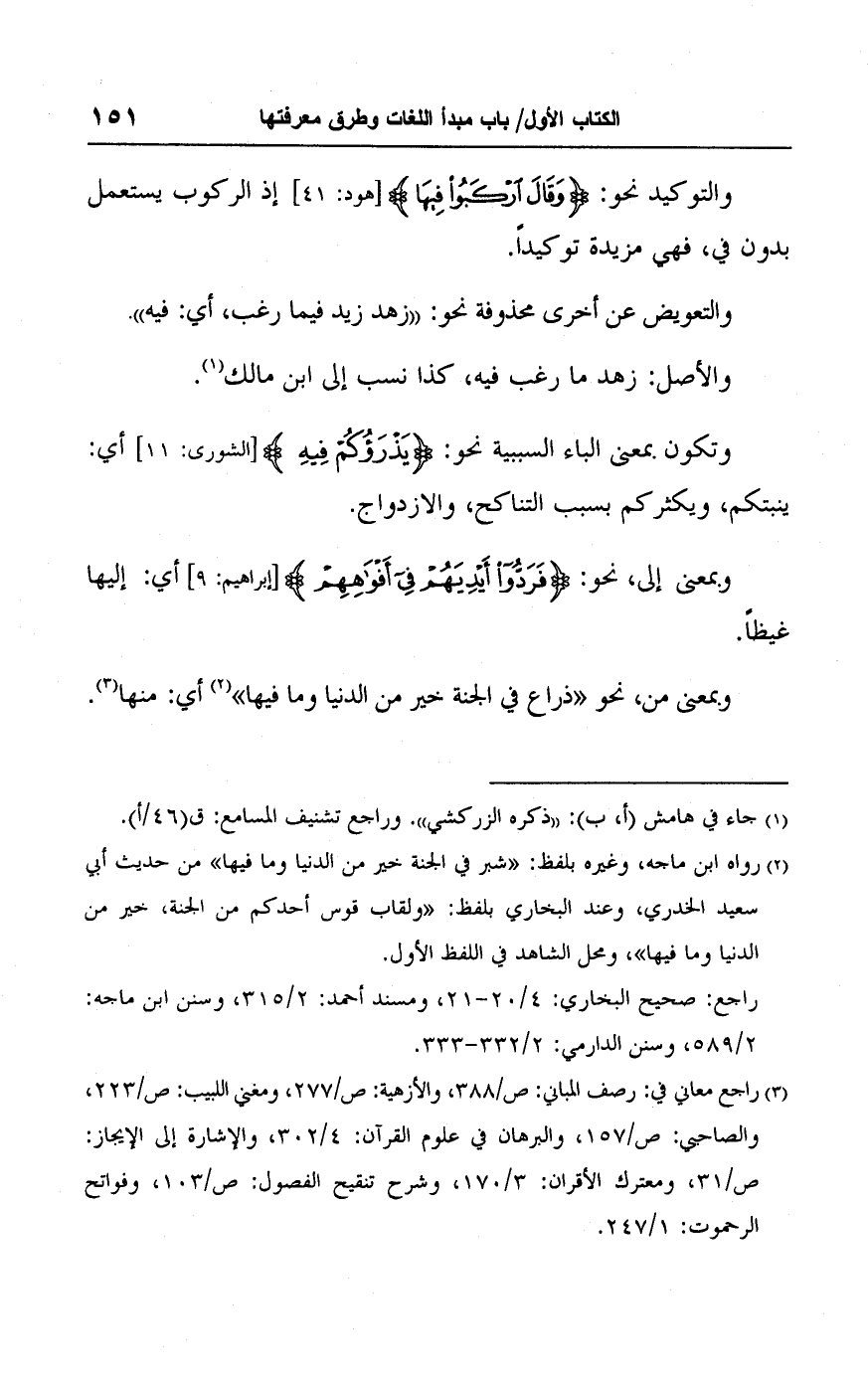 (٣) راجع معاني في: رصف المباني: ص / ٣٨٨، والأزهية: ص / ٢٧٧، ومغني اللبيب: ص/ ٢٢٣، والصاحبي: ص / ١٥٧، والبرهان في علوم القرآن: ٤/ ٣٠٢، والإشارة إلى الإيجاز: ص/ ٣١، ومعترك الأقران: ٣/ ١٧٠، وشرح تنقيح الفصول: ص / ١٠٣، وفواتح الرحموت: ١/ ٢٤٧.