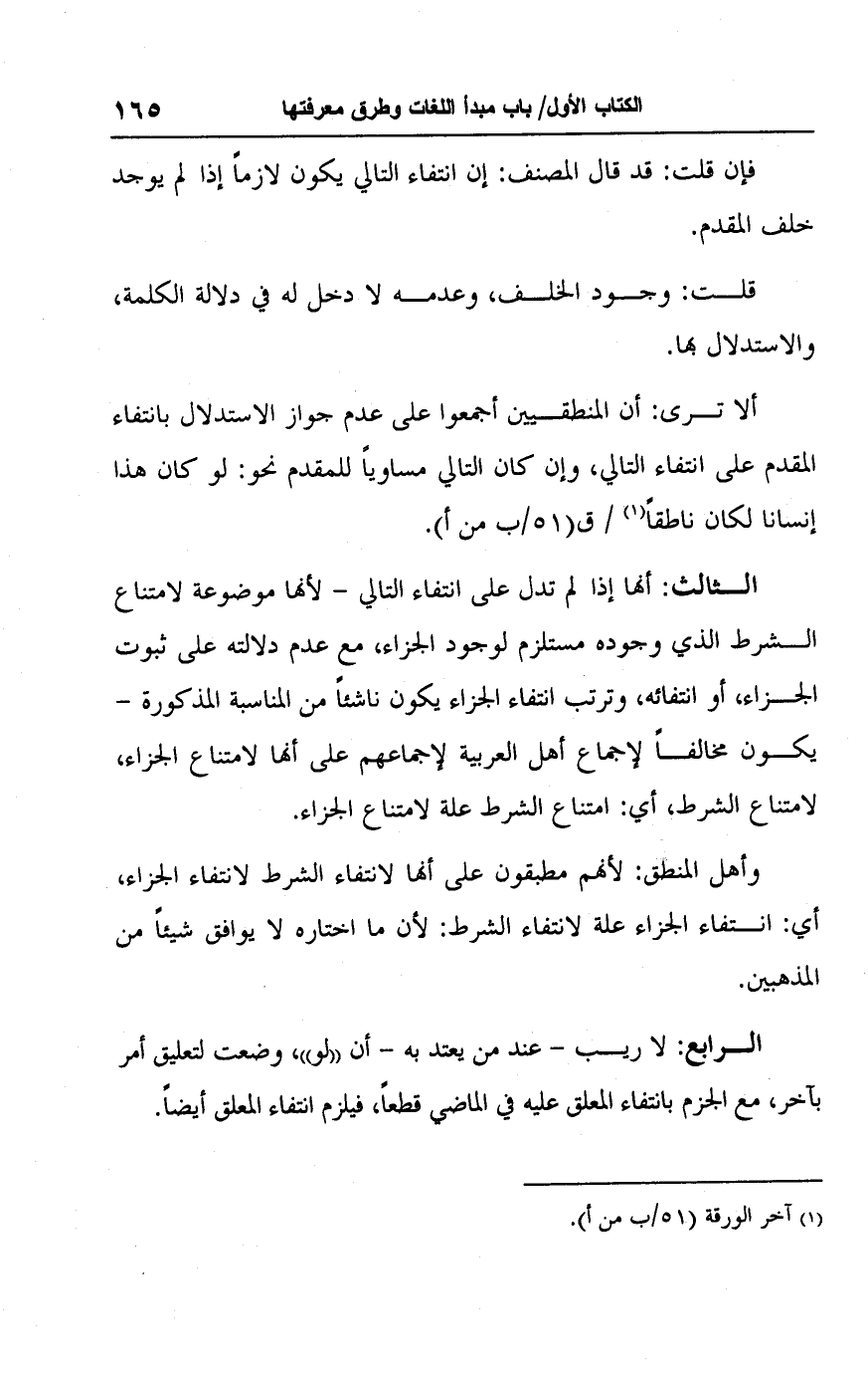 ألا ترى: أن المنطقيين أجمعوا على عدم جواز الاستدلال بانتفاء المقدم على انتفاء التالي، وإن كان التالي مساويًا للمقدم نحو: لو كان هذا إنسانا لكان ناطقًا (١) / ق (٥١/ ب من أ).