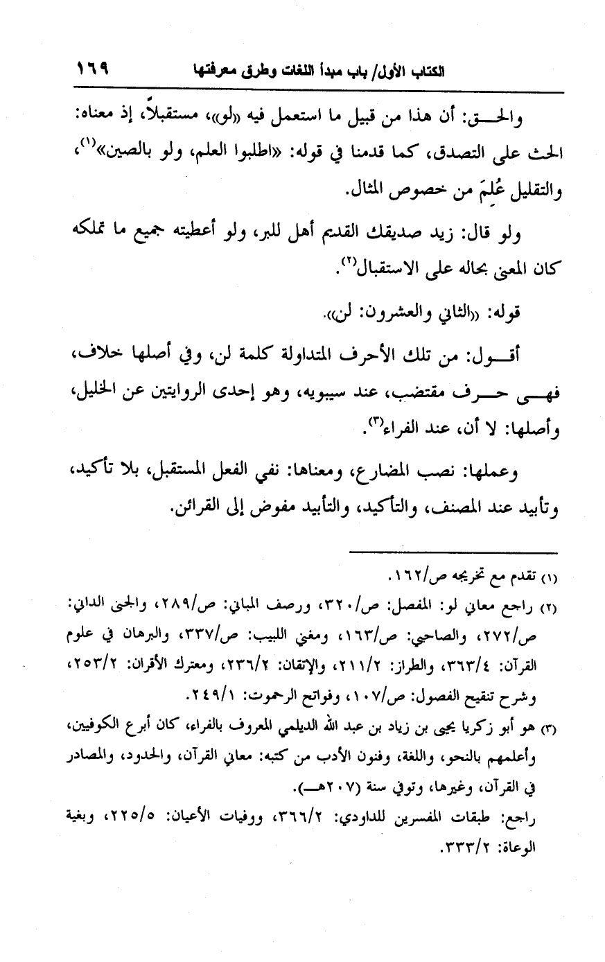 (٢) راجع معاني لو: المفصل: ص/ ٣٢٠، ورصف المباني: ص/ ٢٨٩، والجنى الداني: ص/ ٢٧٢، والصاحبي: ص/ ١٦٣، ومغني اللبيب: ص/ ٣٣٧، والبرهان في علوم القرآن: ٤/ ٣٦٣، والطراز: ٢/ ٢١١، والإتقان: ٢/ ٢٣٦، ومعترك الأقران: ٢/ ٢٥٣، وشرح تنقيح الفصول: ص/ ١٠٧، وفواتح الرحموت: ١/ ٢٤٩.