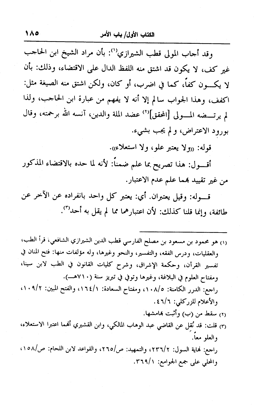 (١) هو محمود بن مسعود بن مصلح الفارسي قطب الدين الشيرازي الشافعي، قرأ الطب، والعقليات، ودرس الفقه، والتفسير، والنحو وغيرها، وله مؤلفات منها: فتح المنان في تفسير القرآن، وحكمة الإشراق، وشرح كليات القانون في الطب لابن سينا، ومفتاح العلوم في البلاغة، وغيرها وتوفي في تبريز سنة (٧١٠ هـ).