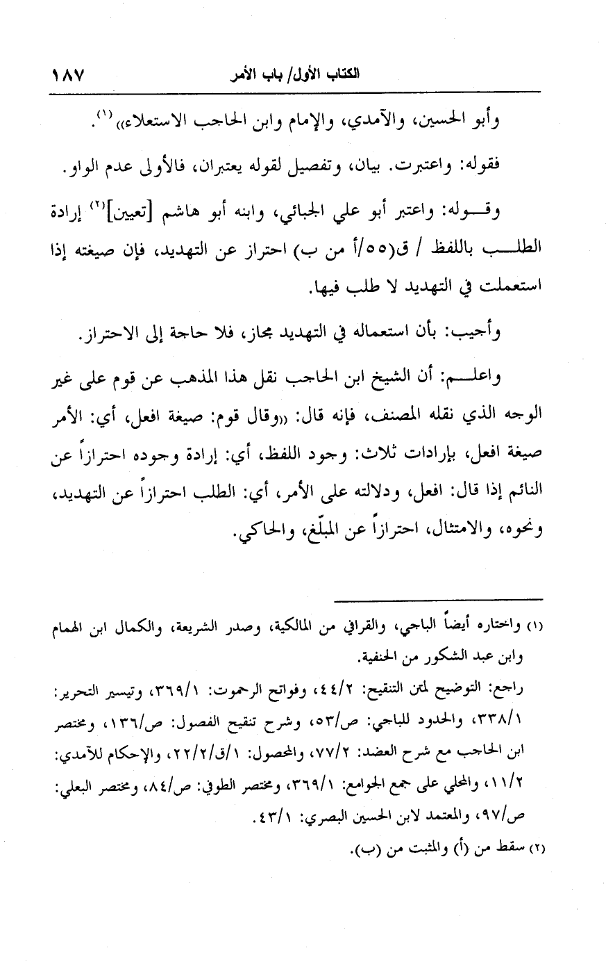 وقوله: واعتبر أبو على الجبائي، وابنه أبو هاشم [تعيين] (٢) إرادة الطلب باللفظ/ ق (٥٥/ أمن ب) احتراز عن التهديد، فإن صيغته إذا استعملت في التهديد لا طلب فيها.