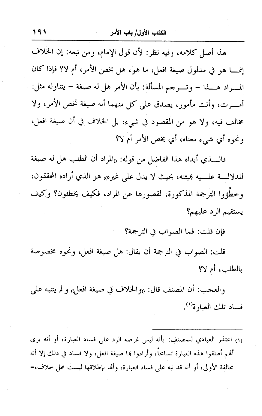 (١) اعتذر العبادي للمصنف: بأنه ليس غرضه الرد على فساد العبارة، أو أنه يرى أنهم أطلقوا هذه العبارة تسامحًا، وأرادوا بها صيغة افعل، ولا فساد في ذلك إلا أنه مخالفة الأولى، أو أنه قد نبه على فساد العبارة، وأنها بإطلاقها ليست محل خلاف، =