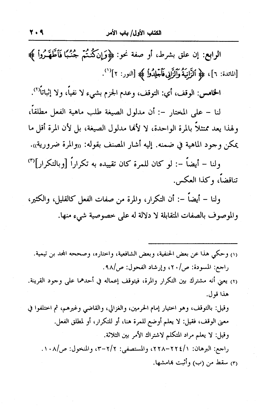 وقيل: بالتوقف، وهو اختيار إمام الحرمين، والغزالي، والقاضي وغيرهم، ثم اختلفوا في معنى الوقف، فقيل: لا يعلم أوضع للمرة هنا، أو للتكرار، أو لمطلق الفعل.