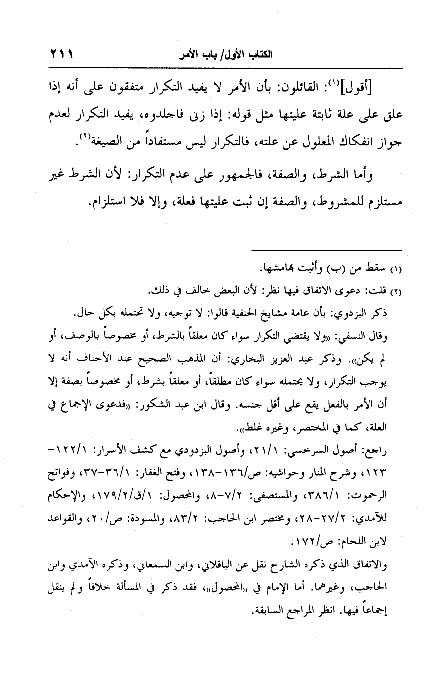 وقال النسفي: "ولا يقتضي التكرار سواء كان معلقًا بالشرط، أو مخصوصًا بالوصف، أو لم يكن". وذكر عبد العزيز البخاري: أن المذهب الصحيح عند الأحناف أنه لا يوجب التكرار، ولا يحتمله سواء كان مطلقًا، أو معلقًا بشرط، أو مخصوصًا بصفة إلا أن الأمر بالفعل يقع على أقل جنسه. وقال ابن عبد الشكور: "فدعوى الإجماع في العلة، كما في المختصر، وغيره غلط".