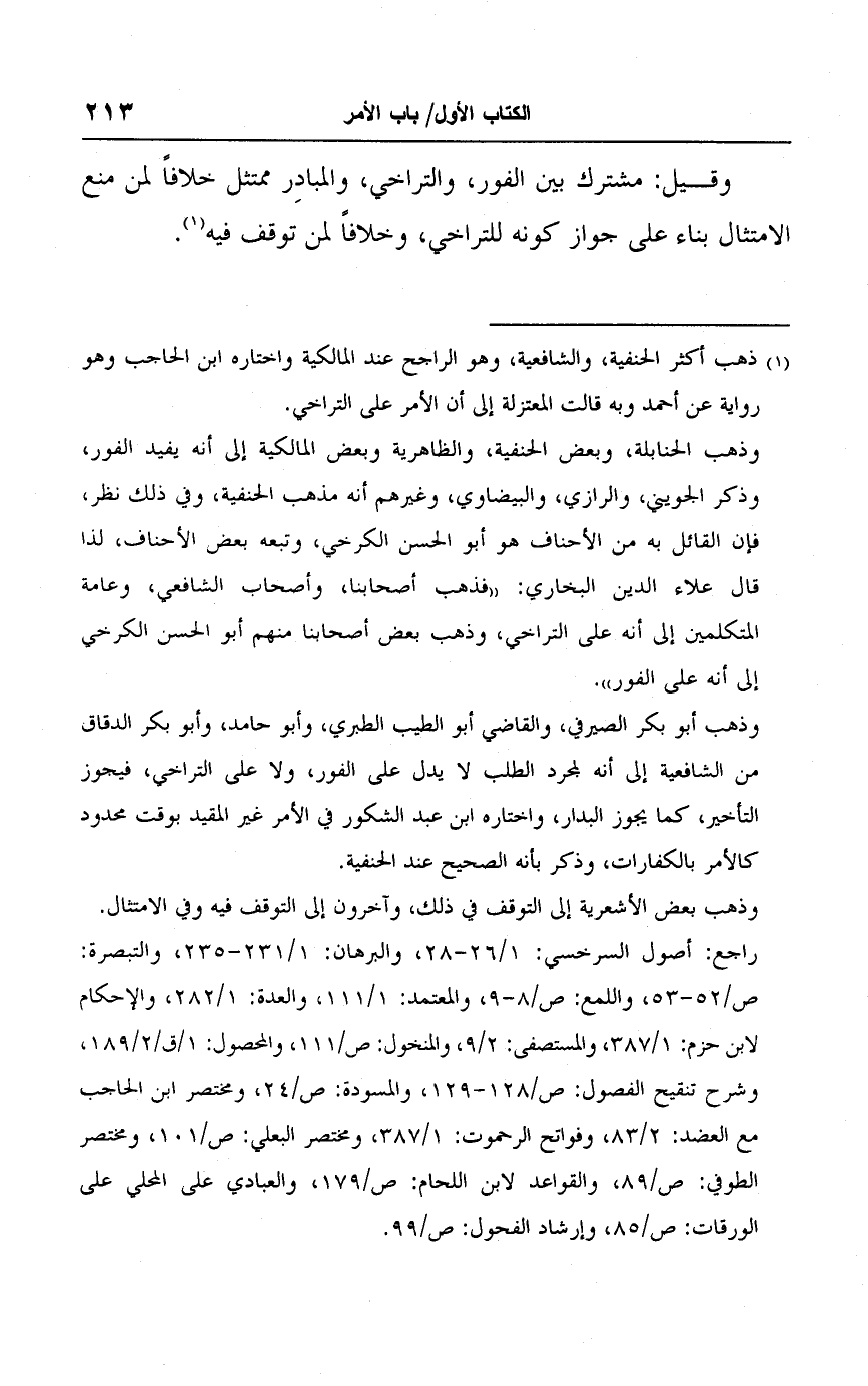 (١) ذهب أكثر الحنفية، والشافعية، وهو الراجح عند المالكية واختاره ابن الحاجب وهو رواية عن أحمد وبه قالت المعتزلة إلى أن الأمر على التراخي.