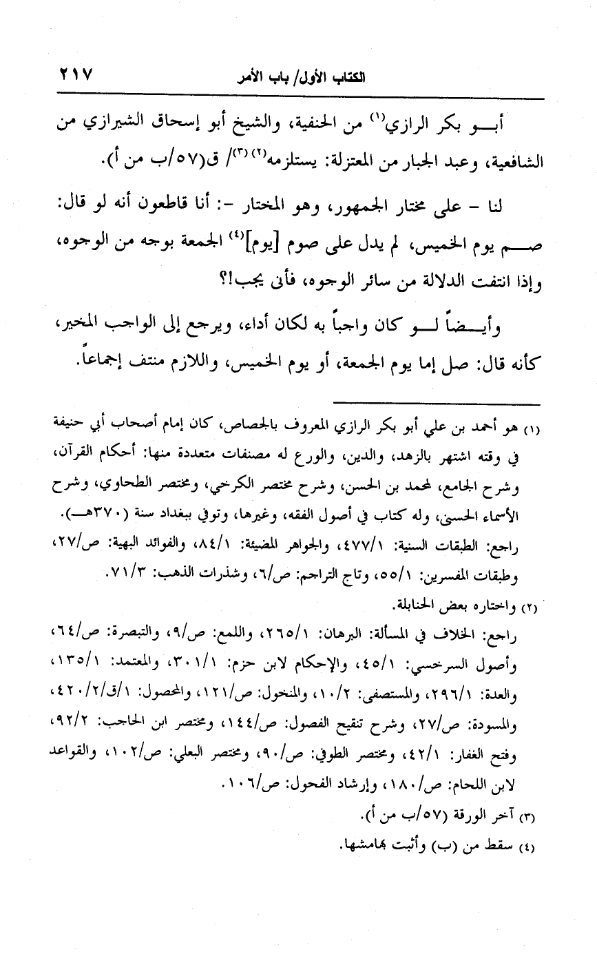 أبو بكر الرازي (١) من الحنفية، والشيخ أبو إسحاق الشيرازي من الشافعية، وعبد الجبار من المعتزلة: يستلزمه (٢) (٣) / ق (٥٧/ ب من أ).