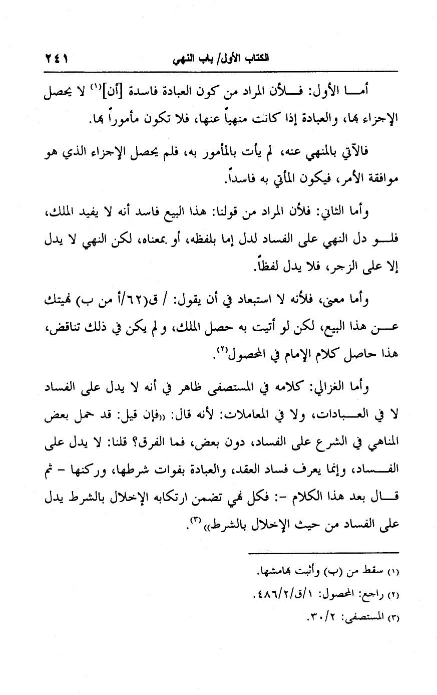 وأما الغزالي: كلامه في المستصفى ظاهر في أنه لا يدل على الفساد لا في العبادات، ولا في المعاملات: لأنه قال: "فإن قيل: قد حمل بعض المناهي في الشرع على الفساد، دون بعض، فما الفرق؟ قلنا: لا يدل على الفساد، وإنما يعرف فساد العقد، والعبادة بفوات شرطها، وركنها - ثم قال بعد هذا الكلام -: فكل نهي تضمن ارتكابه الإخلال بالشرط يدل على الفساد من حيث الإخلال بالشرط" (٣).