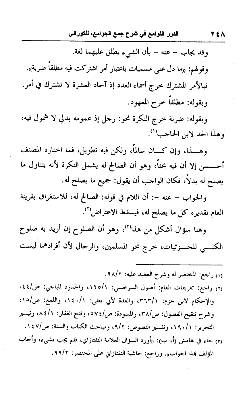 (٢) راجع: تعريفات العام: أصول السرخسي: ١/ ١٢٥، والحدود للباجي: ص/ ٤٤، والإحكام لابن حزم: ١/ ٣٦٣، والعدة لأبي يعلى: ١/ ١٤٠، واللمع: ص/ ١٥، وشرح تنقيح الفصول: ص/ ٣٨، والمسودة: ص/ ٥٧٤، وفتح الغفار: ١/ ٨٤، وتيسير التحرير: ١/ ١٩٠، وتفسير النصوص: ٢/ ٩، ومباحث الكتاب والسنة: ص/ ١٤٧.