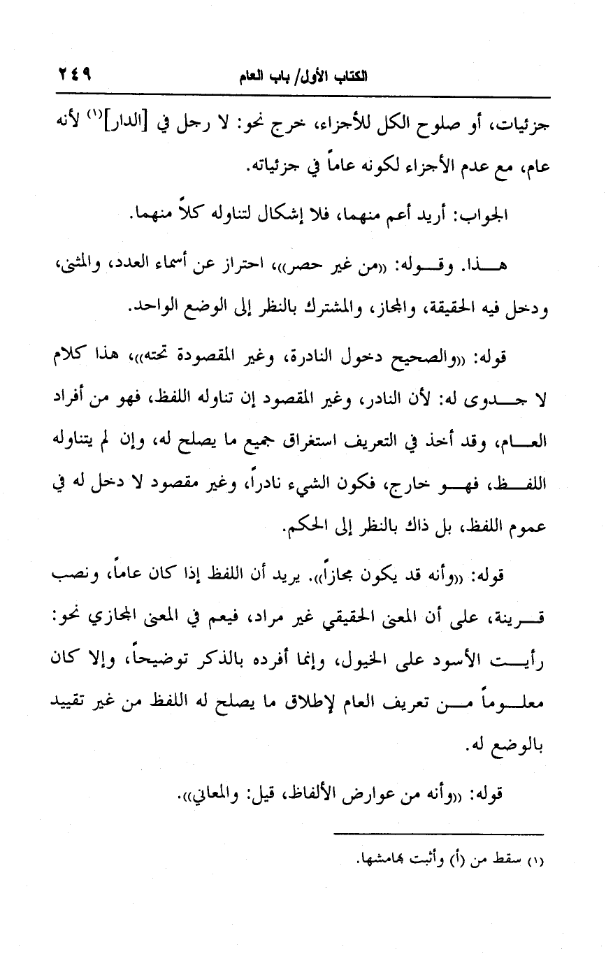 قوله: "والصحيح دخول النادرة، وغير المقصودة تحته"، هذا كلام لا جدوى له: لأن النادر، وغير المقصود إن تناوله اللفظ، فهو من أفراد العام، وقد أخذ في التعريف استغراق جميع ما يصلح له، وإن لم يتناوله اللفظ، فهو خارج، فكون الشيء نادرًا، وغير مقصود لا دخل له في عموم اللفظ، بل ذاك بالنظر إلى الحكم.