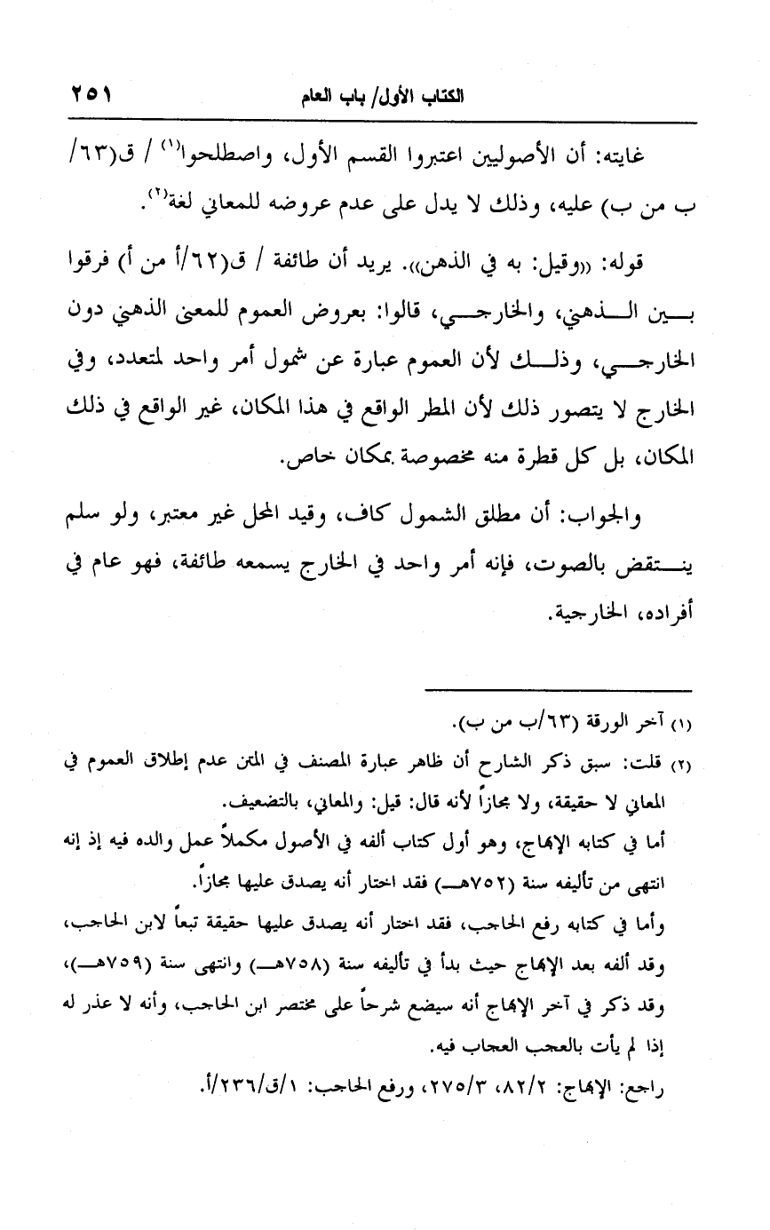 قوله: "وقيل: به في الذهن". يريد أن طائفة/ ق (٦٢/ أمن أ) فرقوا بين الذهني، والخارجي، قالوا: بعروض العموم للمعنى الذهني دون الخارجي، وذلك لأن العموم عبارة عن شمول أمر واحد لمتعدد، وفي الخارج لا يتصور ذلك لأن المطر الواقع في هذا المكان، غير الواقع في ذلك المكان، بل كل قطرة منه مخصوصة بمكان خاص.