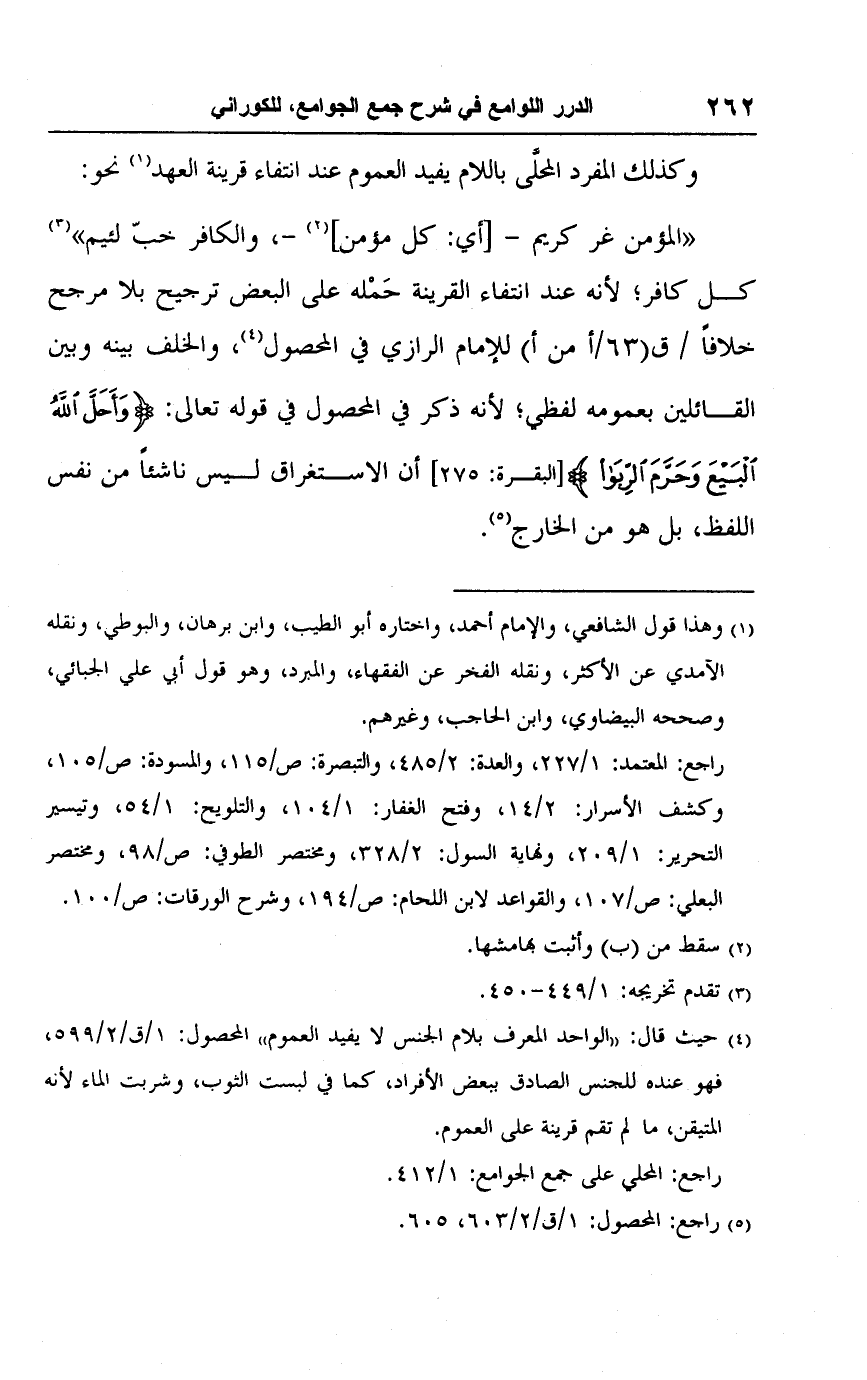 "المؤمن غر كريم -[أي: كل مومن] (٢) -، والكافر خبّ لئيم" (٣) كل كافر؛ لأنه عند انتفاء القرينة حَمْله على البعض ترجيح بلا مرجح خلافًا / ق (٦٣/ أمن أ) للإمام الرازي في المحصول (٤)، والخلف بينه وبين القائلين بعمومه لفظي؛ لأنه ذكر في المحصول في قوله تعالى: {وَأَحَلَّ اللَّهُ الْبَيْعَ وَحَرَّمَ الرِّبَا} [البقرة: ٢٧٥] أن الاستغراق ليس ناشئًا من نفس اللفظ، بل هو من الخارج (٥).