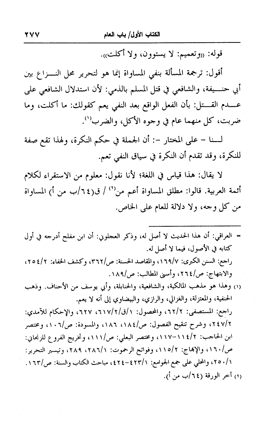 أقول: ترجمة المسألة بنفي المساواة إنما هو لتحرير محل النزاع بين أبي حنيفة، والشافعي في قتل المسلم بالذمي: لأن استدلال الشافعي على عدم القتل: بأن الفعل الواقع بعد النفي يعم كقولك: ما أكلت، وما ضربت، كل منهما عام في وجوه الأكل، والضرب (١).