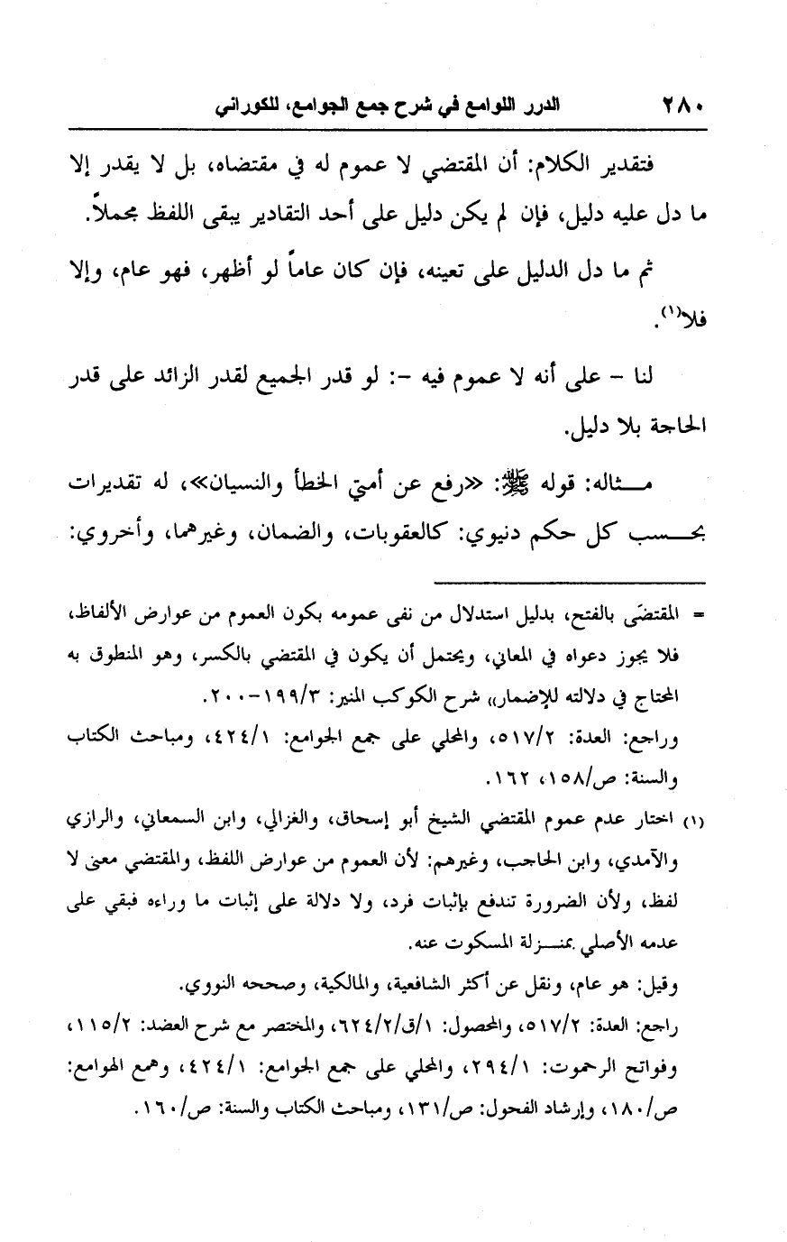 (١) اختار عدم عموم المقتضي الشيخ أبو إسحاق، والغزالي، وابن السمعاني، والرازي والآمدي، وابن الحاجب، وغيرهم: لأن العموم من عوارض اللفظ، والمقتضي معنى لا لفظ، ولأن الضرورة تندفع بإثبات فرد، ولا دلالة على إثبات ما وراءه فبقي على عدمه الأصلي بمنزلة المسكوت عنه.