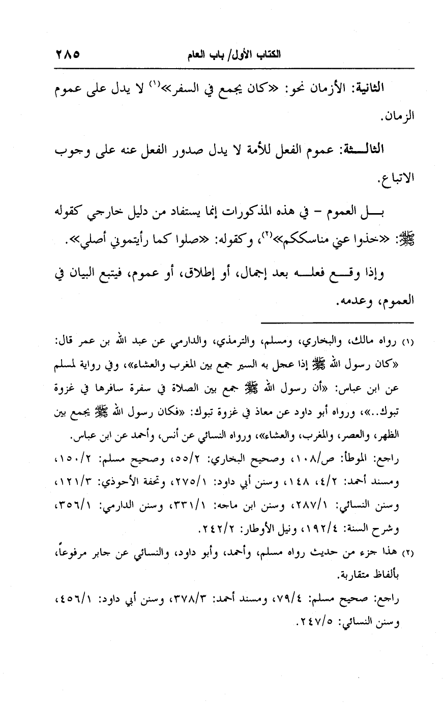 الثانية: الأزمان نحو: "كان يجمع في السفر" (١) لا يدل على عموم الزمان.