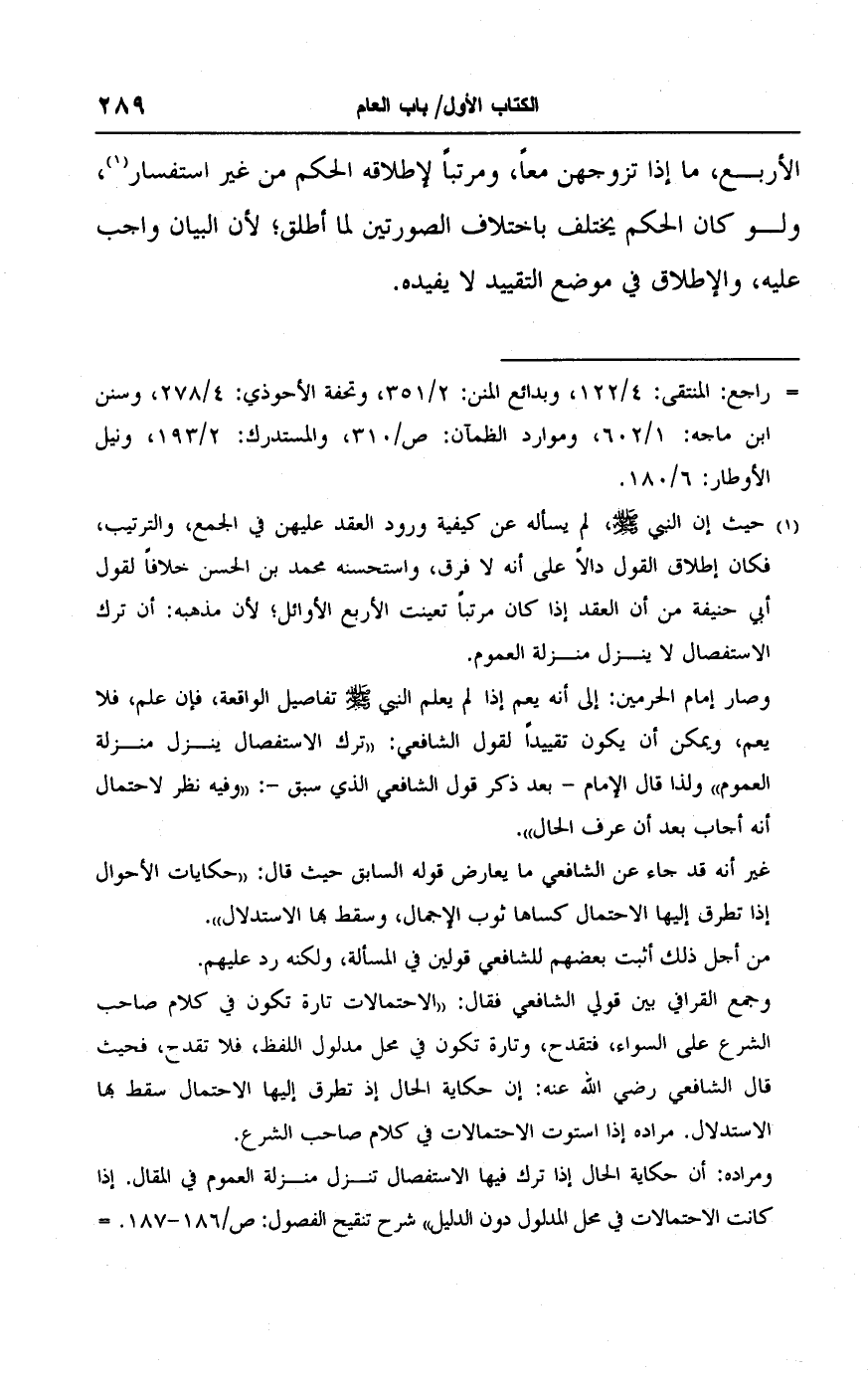 ومراده: أن حكاية الحال إذا ترك فيها الاستفصال تنزل منزلة العموم في المقال. إذا كانت الاحتمالات في محل المدلول دون الدليل" شرح تنقيح الفصول: ص/ ١٨٦ - ١٨٧. =