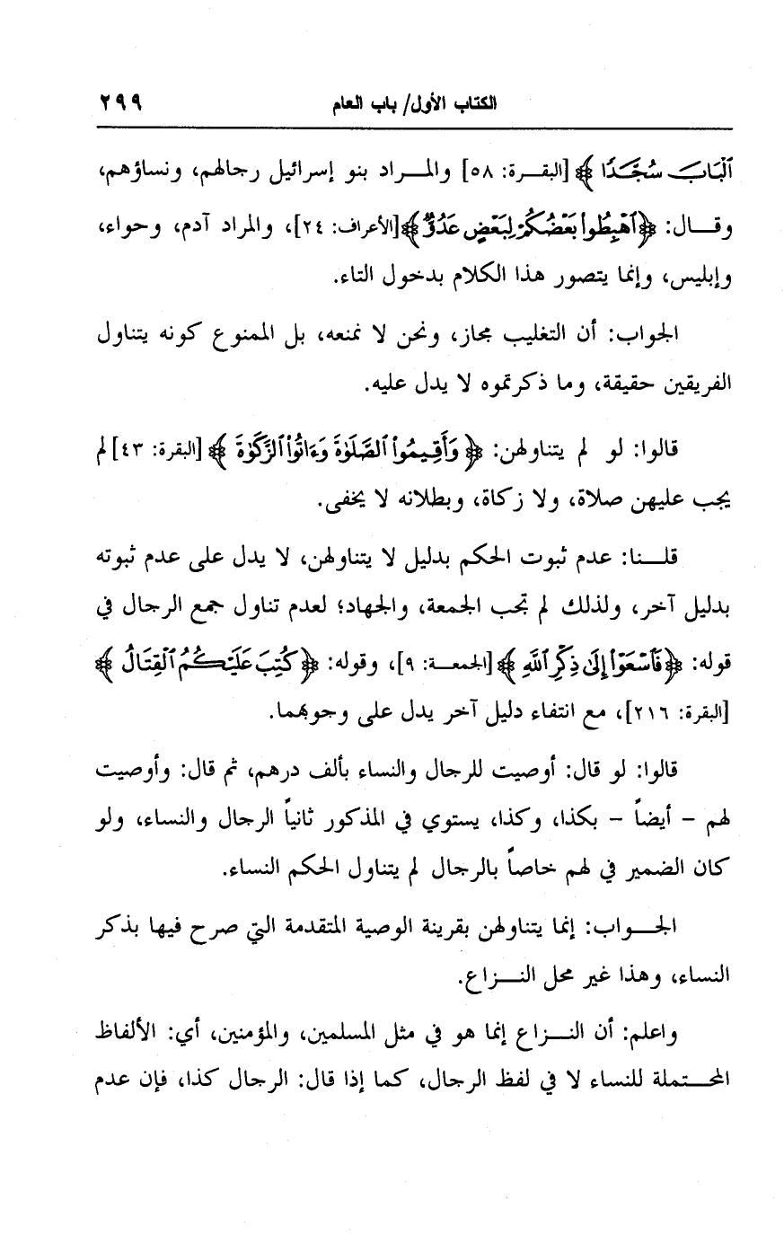 قالوا: لو لم يتناولهن: {وَأَقِيمُوا الصَّلَاةَ وَآتُوا الزَّكَاةَ} [البقرة: ٤٣] لم يجب عليهن صلاة، ولا زكاة، وبطلانه لا يخفى.