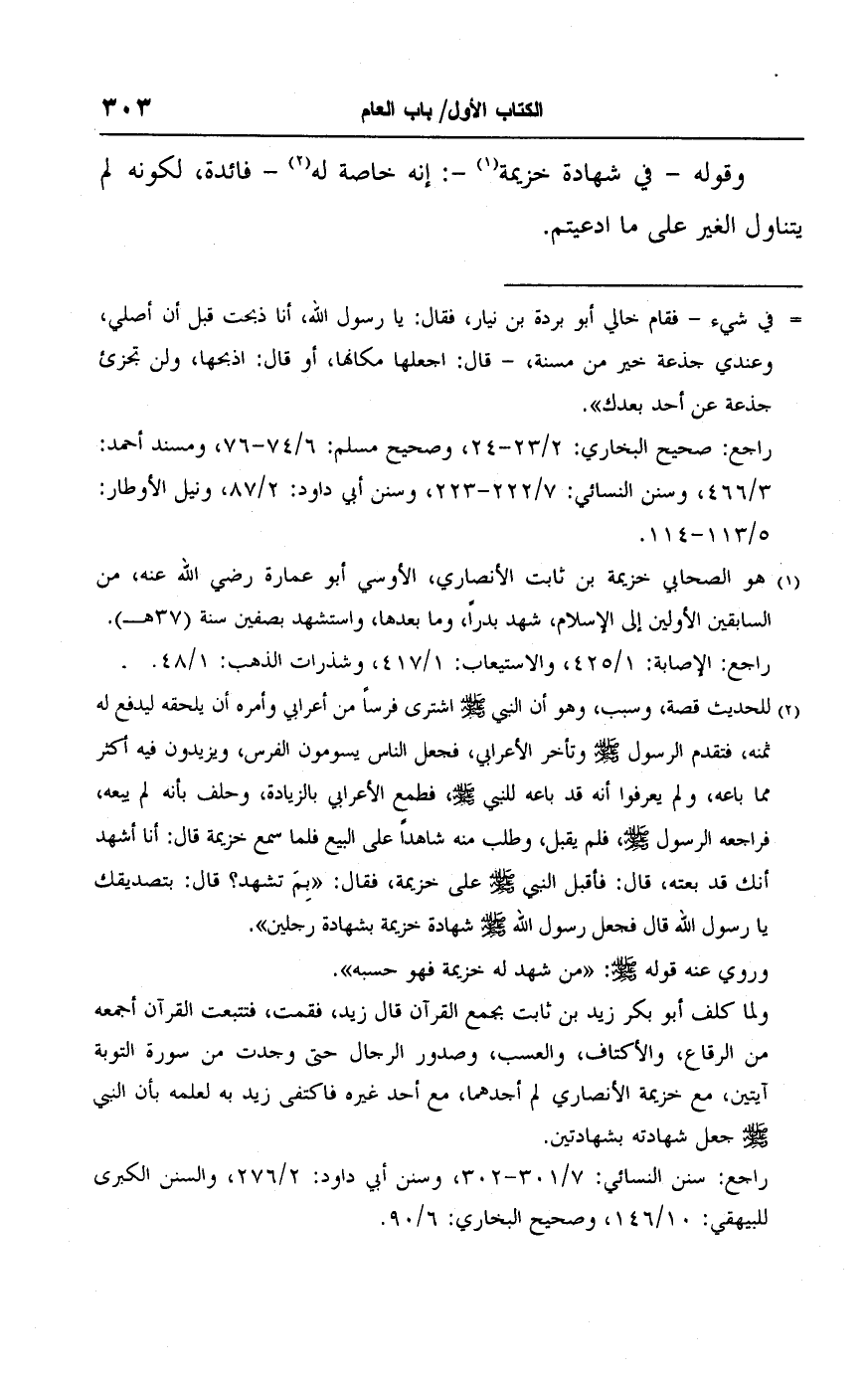 (٢) للحديث قصة، وسبب، وهو أن النبي - صلى الله عليه وسلم - اشترى فرسًا من أعرابي وأمره أن يلحقه ليدفع له ثمنه، فتقدم الرسول - صلى الله عليه وسلم - وتأخر الأعرابي، فجعل الناس يسومون الفرس، ويزيدون فيه أكثر مما باعه، ولم يعرفوا أنه قد باعه للنبي - صلى الله عليه وسلم -، فطمع الأعرابى بالزيادة، وحلف بأنه لم يبعه، فراجعه الرسول - صلى الله عليه وسلم -، فلم يقبل، وطلب منه شاهدًا على البيع فلما سمع خزيمة قال: أنا أشهد أنك قد بعته، قال: فأقبل النبي - صلى الله عليه وسلم - على خزيمة، فقال: "بِمَ تشهد؟ قال: بتصديقك يا رسول الله قال فجعل رسول الله - صلى الله عليه وسلم - شهادة خزيمة بشهادة رجلين".