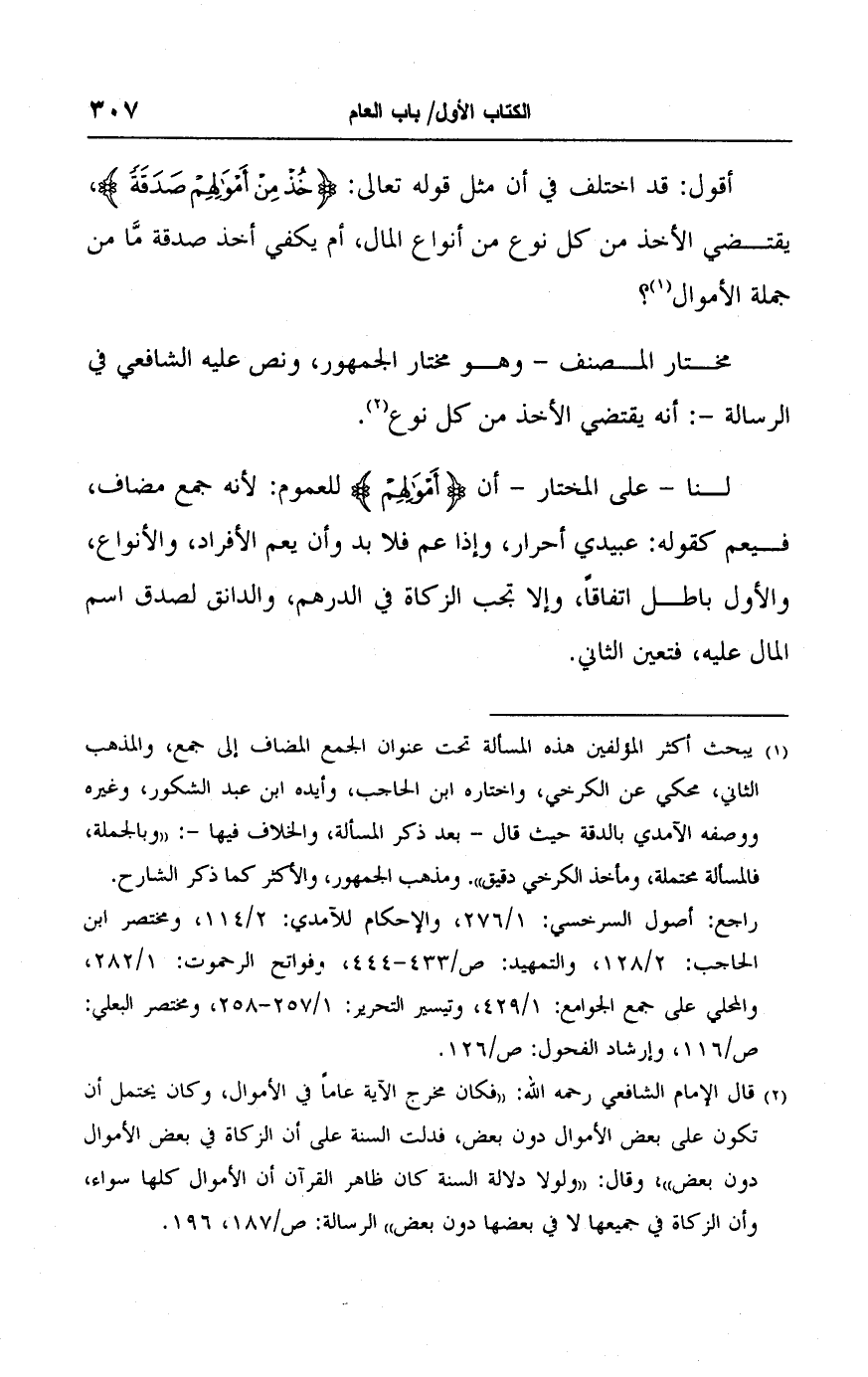 (٢) قال الإمام الشافعي رحمه الله: "فكان مخرج الآية عامًا في الأموال، وكان يحتمل أن تكون على بعض الأموال دون بعض، فدلت السنة على أن الزكاة في بعض الأموال دون بعض"، وقال: "ولولا دلالة السنة كان ظاهر القرآن أن الأموال كلها سواء، وأن الزكاة في جميعها لا في بعضها دون بعض" الرسالة: ص/ ١٨٧، ١٩٦.