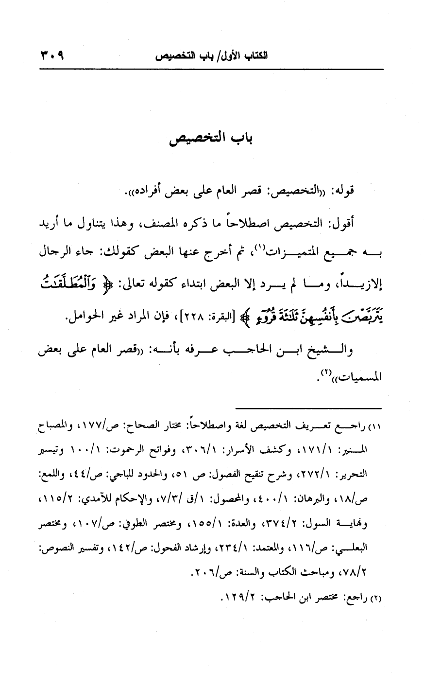 (١) راجع تعريف التخصيص لغة واصطلاحًا: مختار الصحاح: ص/ ١٧٧، والمصباح المنير: ١/ ١٧١، وكشف الأسرار: ١/ ٣٠٦، وفواتح الرحموت: ١/ ١٠٠ وتيسير التحرير: ١/ ٢٧٢، وشرح تنقيح الفصول: ص ٥١، والحدود للباجي: ص/ ٤٤، واللمع: ص/ ١٨، والبرهان: ١/ ٤٠٠، والمحصول: ١/ ق/ ٣/ ٧، والإحكام للآمدي: ٢/ ١١٥، ونهاية السول: ٢/ ٣٧٤، والعدة: ١/ ١٥٥، ومختصر الطوفي: ص/ ١٠٧، ومختصر البعلي: ص/١١٦، والمعتمد: ١/ ٢٣٤، وإرشاد الفحول: ص/ ١٤٢، وتفسير النصوص: ٢/ ٧٨، ومباحث الكتاب والسنة: ص/ ٢٠٦.