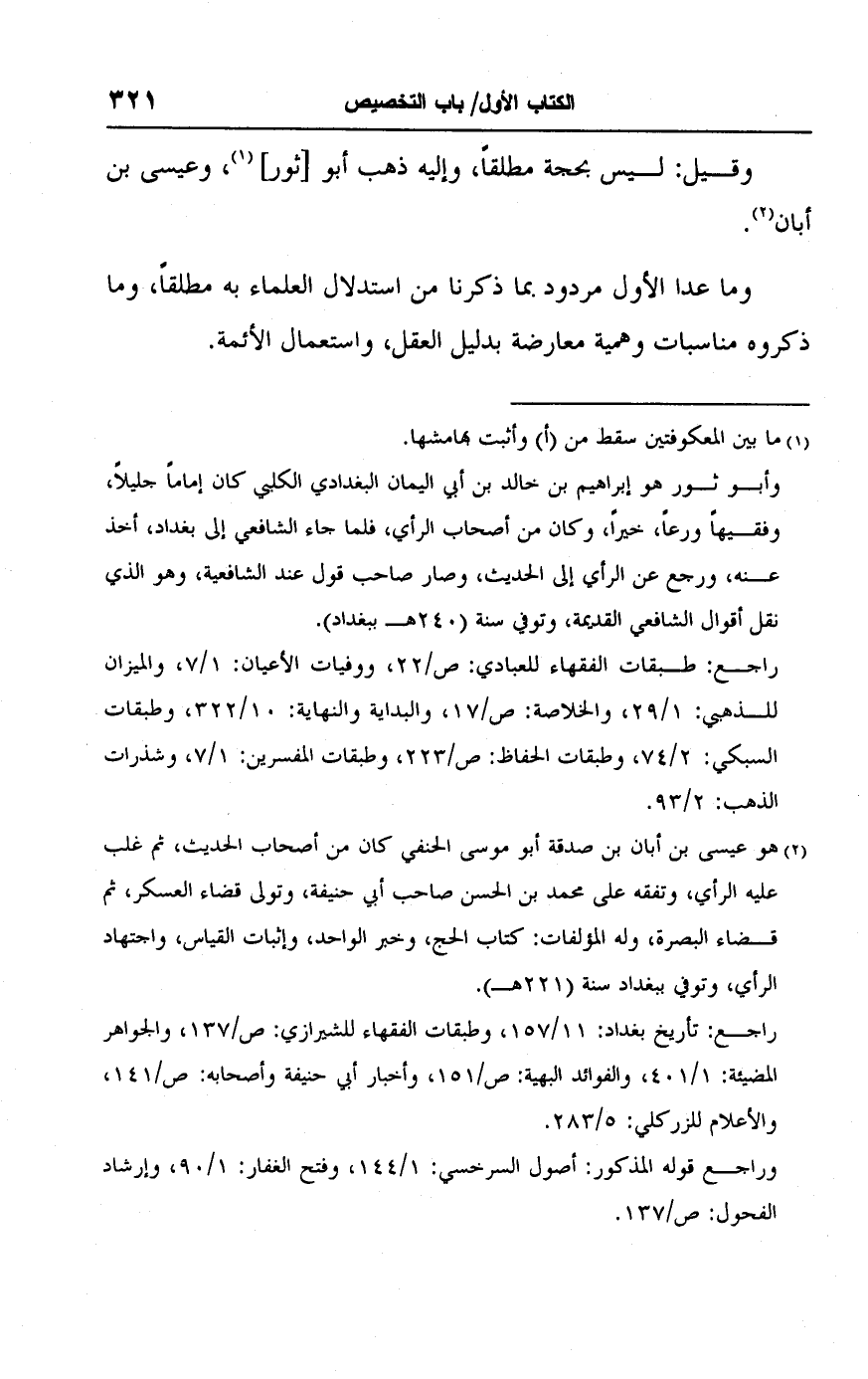 (٢) هو عيسى بن أبان بن صدقة أبو موسى الحنفي كان من أصحاب الحديث، ثم غلب عليه الرأي، وتفقه على محمد بن الحسن صاحب أبي حنيفة، وتولى قضاء العسكر، ثم قضاء البصرة، وله المؤلفات: كتاب الحج، وخبر الواحد، وإثبات القياس، واجتهاد الرأي، وتوفي ببغداد سنة (٢٢١ هـ).