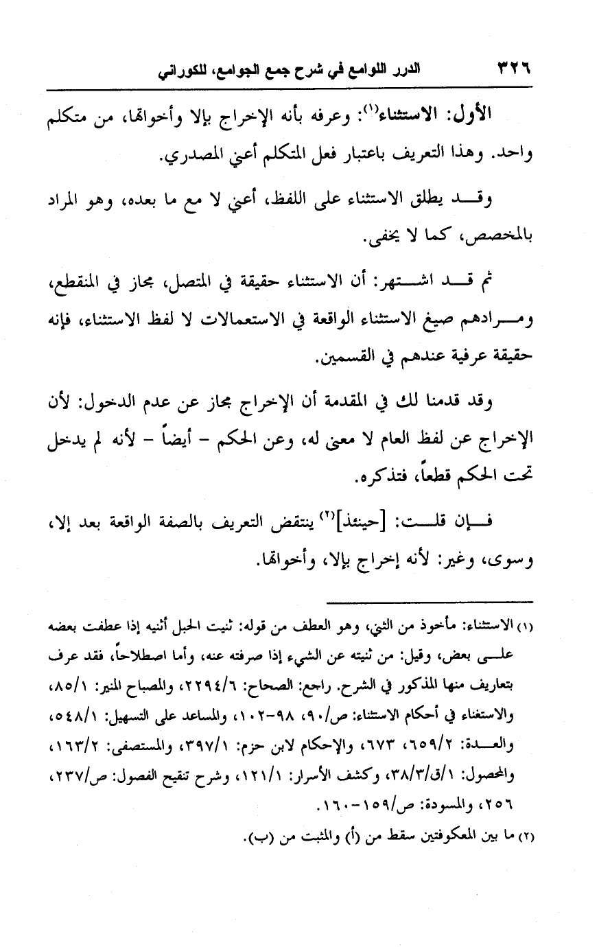 الأول: الاستثناء (١): وعرفه بأنه الإخراج بإلا وأخواتها، من متكلم واحد. وهذا التعريف باعتبار فعل المتكلم أعني المصدري.