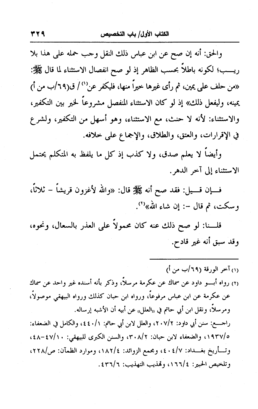 والحق: أنه إن صح عن ابن عباس ذلك النقل وجب حمله على هذا بلا ريب؛ لكونه باطلًا بحسب الظاهر إذ لو صح انفصال الاستثناء لما قال - صلى الله عليه وسلم -: "من حلف على يمين، ثم رأى غيرها خيرًا منها، فليكفر عن (١) / ق (٦٩/ ب من أ) يمينه، وليفعل ذلك" إذ لو كان الاستثناء المنفصل مشروعًا لخير بين التكفير، والاستثناء: لأنه لا حنث، مع الاستثناء، وهو أسهل من التكفير، ولشرع في الإقرارات، والعتق، والطلاق، والإجماع على خلافه.