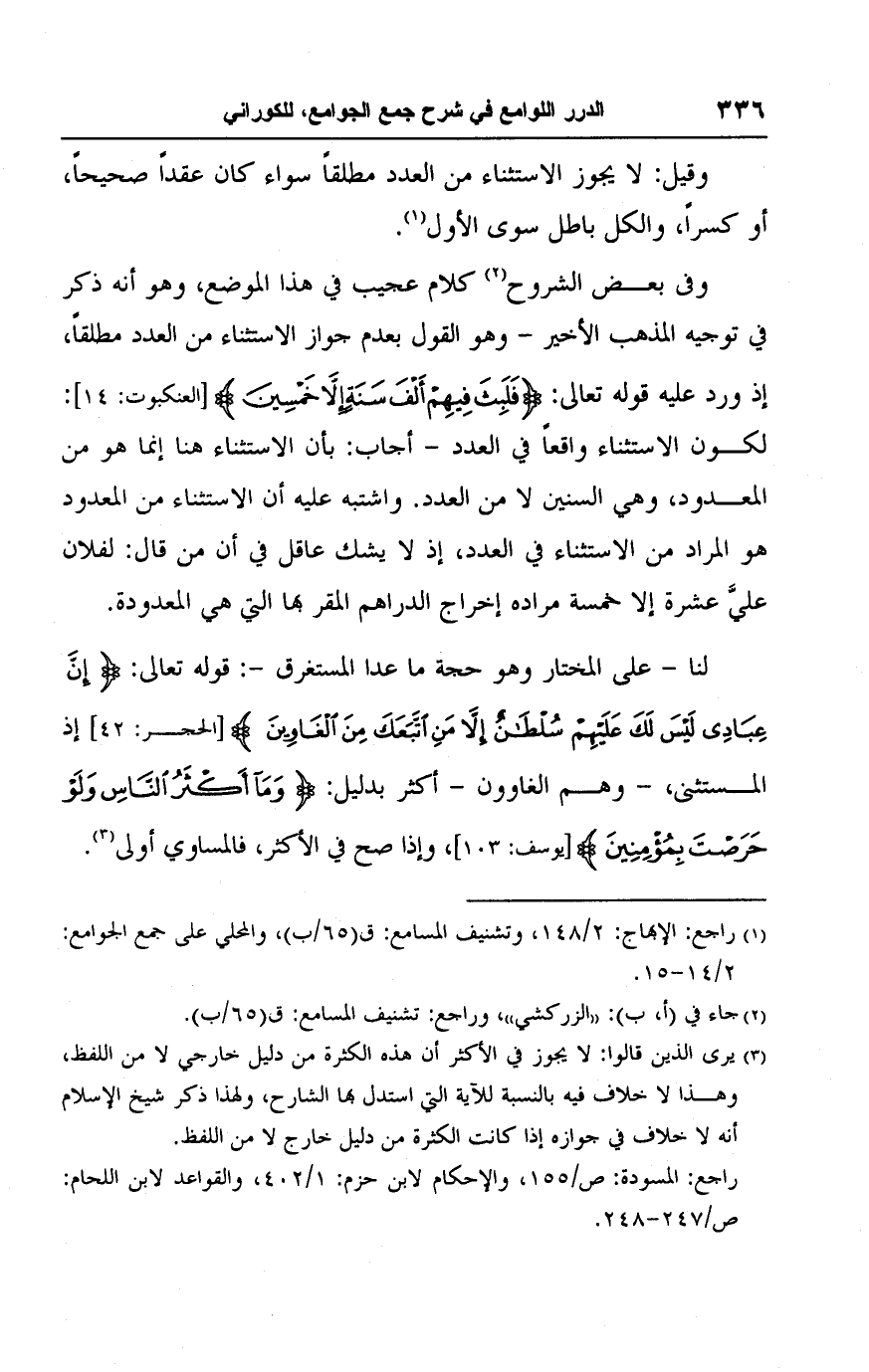 (٣) يرى الذين قالوا: لا يجوز في الأكثر أن هذه الكثرة من دليل خارجي لا من اللفظ، وهذا لا خلاف فيه بالنسبة للآية إلى استدل بها الشارح، ولهذا ذكر شيخ الإسلام أنه لا خلاف في جوازه إذا كانت الكثرة من دليل خارج لا من اللفظ.