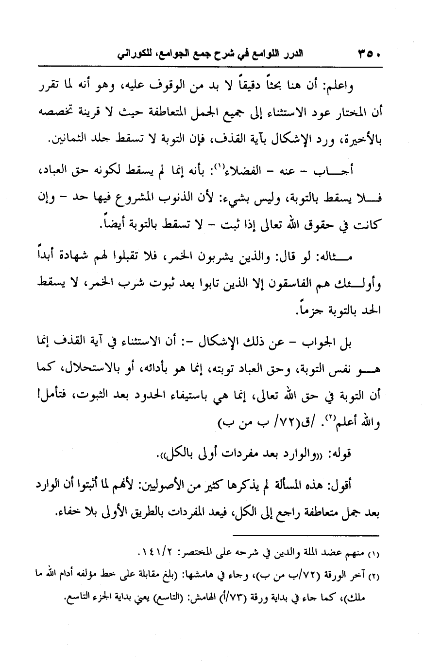 واعلم: أن هنا بحثًا دقيقًا لا بد من الوقوف عليه، وهو أنه لما تقرر أن المختار عود الاستثناء إلى جميع الجمل المتعاطفة حيث لا قرينة تخصصه بالأخيرة، ورد الإشكال بآية القذف، فإن التوبة لا تسقط جلد الثمانين.