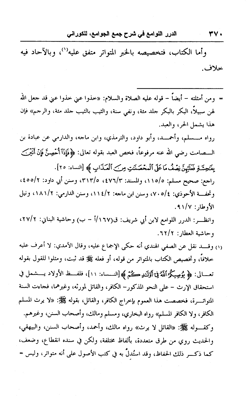 (١) وقد نقل عن الصفي الهندي أنه حكى الإجماع عليه، وقال الآمدي: لا أعرف عليه خلافًا، وتخصيص الكتاب بالمتواتر من قوله، أو فعله - صلى الله عليه وسلم - قد ثبت، ومثلوا للقول بقوله تعالى: {يُوصِيكُمُ اللَّهُ فِي أَوْلَادِكُمْ} [النساء: ١١]، فلفظ الأولاد يشمل في استحقاق الإرث - على النحو المذكور - الكافر، والقاتل لمورثه، وغيرهما, فجاءت السنة المتواترة، فخصصت هذا العموم بإخراج الكافر، والقاتل، بقوله - صلى الله عليه وسلم -: "لا يرث المسلم الكافر، ولا الكافر المسلم" رواه البخاري، ومسلم ومالك، وأصحاب السنن، وغيرهم. وكقوله - صلى الله عليه وسلم -: "القاتل لا يرث" رواه مالك، وأحمد، وأصحاب السنن، والبيهقي، والحديث روي من طرق متعددة، بألفاظ مختلفة، ولكن في سنده انقطاع، وضعف، كما ذكر ذلك الحفاظ، وقد استُدِلَّ به في كتب الأصول على أنه متواتر، وليس =