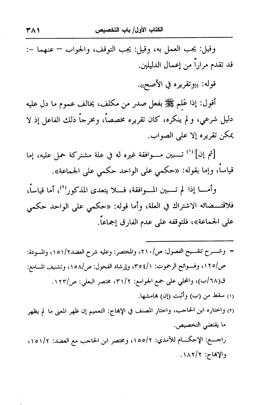 = وشرح تنقيح الفصول: ص/ ٢١٠، والمختصر: وعليه شرح العضد ٢/ ١٥١، والمسودة: ص/ ١٢٥، وفواتح الرحموت: ١/ ٣٥٤، وإرشاد الفحول: ص/ ١٥٨، وتشنيف المسامع: ق (٦٨/ ب)، والمحلي على جمع الجوامع: ٢/ ٣١، مختصر البعلي: ص/ ١٢٣.