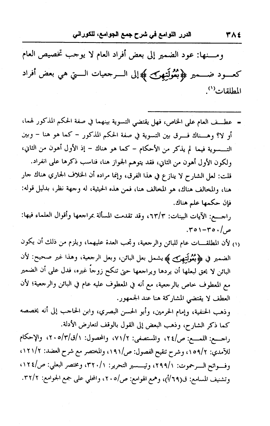 (١) لأن المطلقات عام للبائن والرجعية، وتجب العدة عليهما، ويلزم من ذلك أن يكون الضمير في {وَبُعُولَتُهُنَّ} يشمل بعل البائن، وبعل الرجعية، وهذا غير صحيح: لأن البائن لا يحق لبعلها أن يردها ويراجعها حتى تنكح زوجًا غيره، فدل على أن الضمير مع المعطوف خاص بالرجعية، مع أنه في المعطوف عليه عام في البائن والرجعية؛ لأن العطف لا يقتضي المشاركة هنا عند الجمهور.