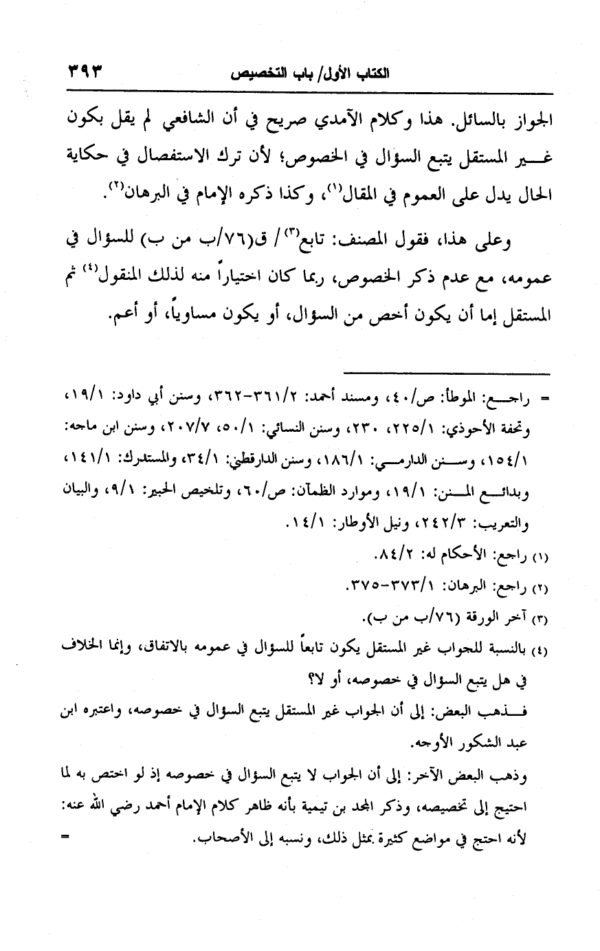 (٤) بالنسبة للجواب غير المستقل يكون تابعًا للسؤال في عمومه بالاتفاق، وإنما الخلاف في هل يتبع السؤال في خصوصه، أو لا؟