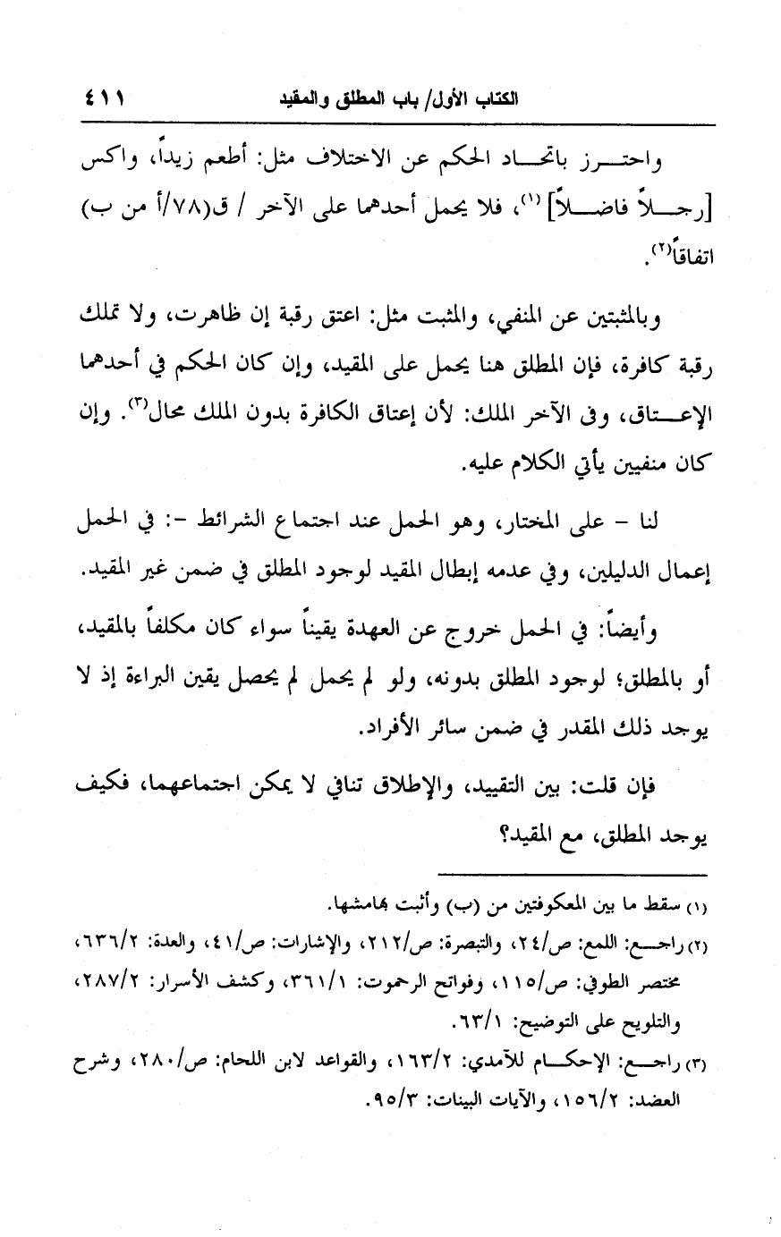 (٢) راجع: اللمع: ص/ ٢٤، والتبصرة: ص/ ٢١٢، والإشارات: ص/ ٤١، والعدة: ٢/ ٦٣٦، مختصر الطوفي: ص/ ١١٥، وفواتح الرحموت: ١/ ٣٦١، وكشف الأسرار: ٢/ ٢٨٧، والتلويح على التوضيح: ١/ ٦٣.