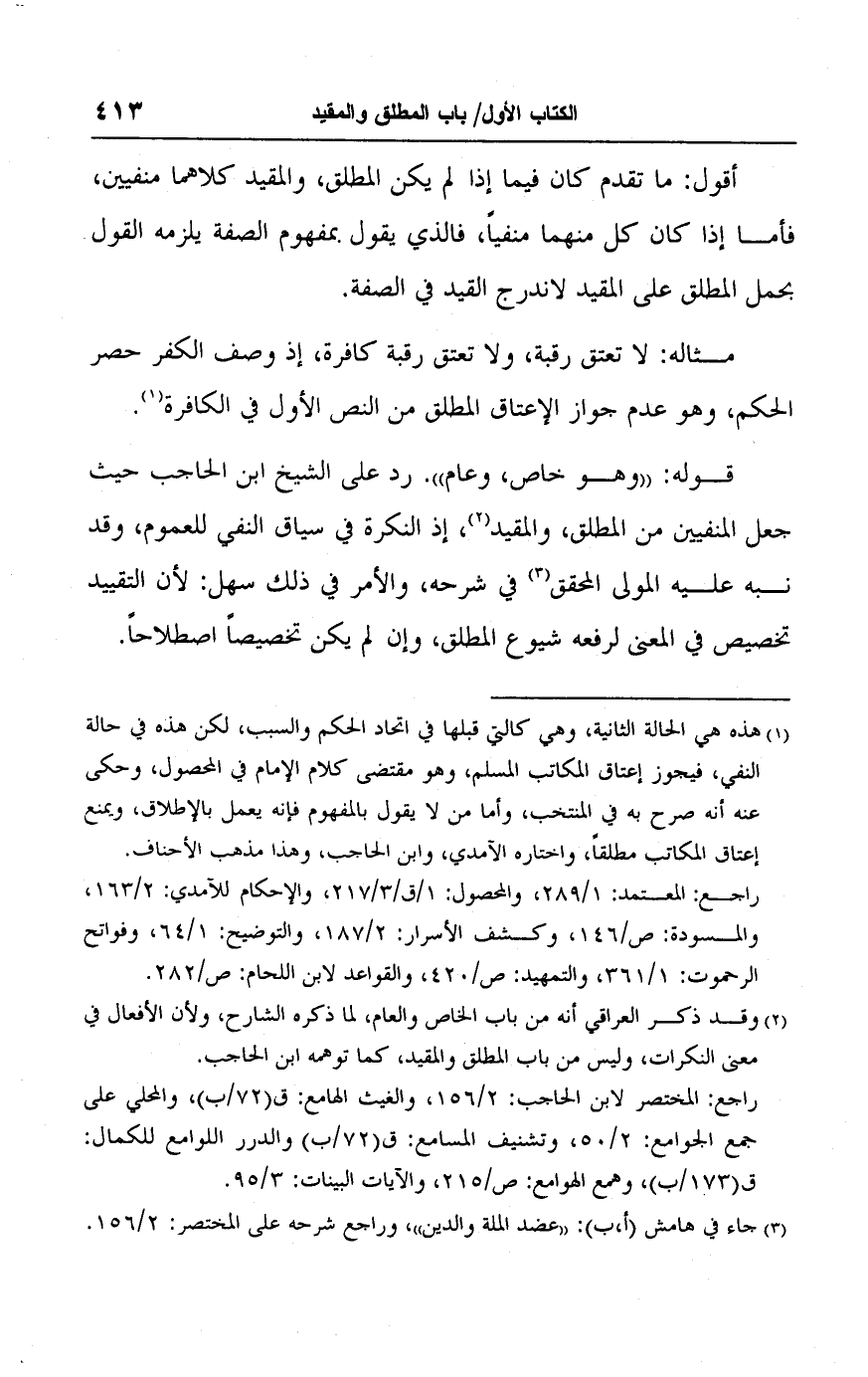 قوله: "وهو خاص، وعام". رد على الشيخ ابن الحاجب حيث جعل المنفيين من المطلق، والمقيد (٢)، إذ النكرة في سياق النفي للعموم، وقد نبه عليه المولى المحقق (٣) في شرحه، والأمر في ذلك سهل: لأن التقييد تخصيص في المعنى لرفعه شيوع المطلق، وإن لم يكن تخصيصًا اصطلاحًا.