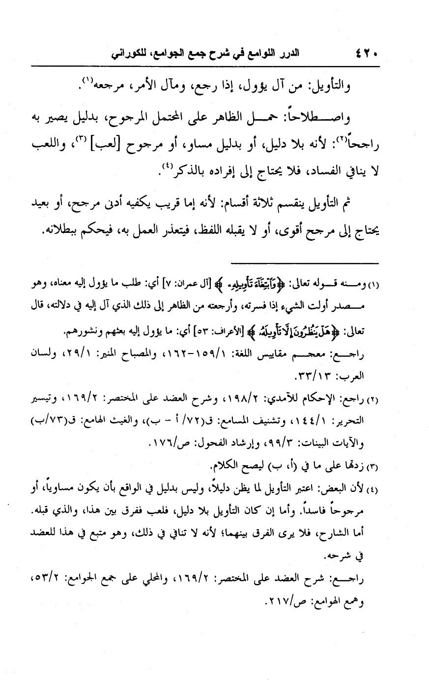(١) ومنه قوله تعالى: {وَابْتِغَاءَ تَأْوِيلِهِ} [آل عمران: ٧] أي: طلب ما يؤول إليه معناه، وهو مصدر أولت الشيء إذا فسرته، وأرجعته من الظاهر إلى ذلك الذي آل إليه في دلالته، قال تعالى: {هَلْ يَنْظُرُونَ إِلَّا تَأْوِيلَهُ} [الأعراف: ٥٣] أي: ما يؤول إليه بعثهم ونشورهم.