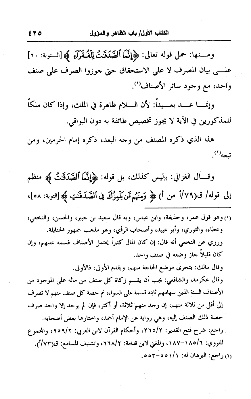 ومنها: حمل قوله تعالى: {إِنَّمَا الصَّدَقَاتُ لِلْفُقَرَاءِ} [التوبة: ٦٠] على بيان المصرف لا على الاستحقاق حتى جوزوا الصرف على صنف واحد، مع وجود سائر الأصناف (١).