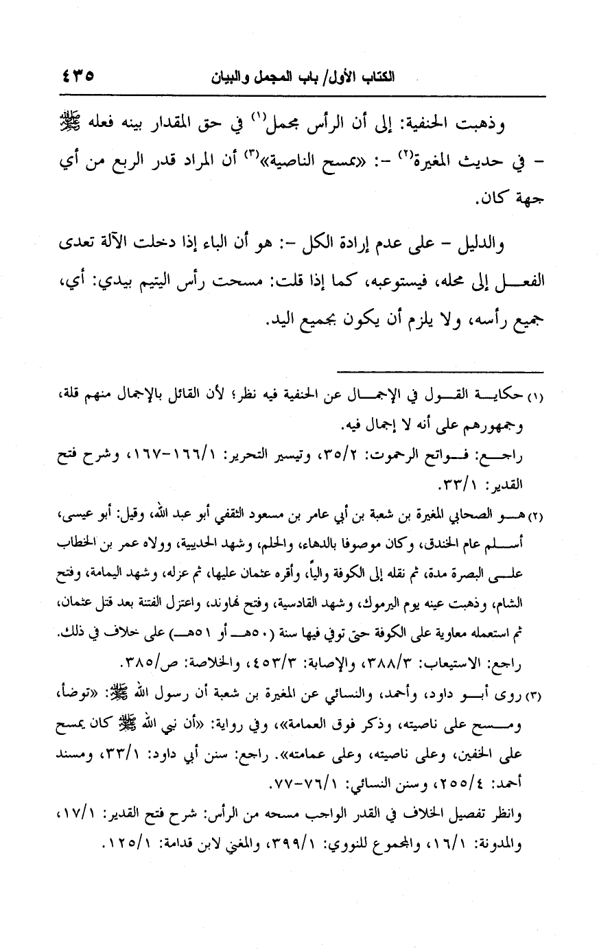 (٣) روى أبو داود، وأحمد، والنسائي عن المغيرة بن شعبة أن رسول الله - صلى الله عليه وسلم -: "توضأ، ومسح على ناصيته، وذكر فوق العمامة"، وفي رواية: "أن نبي الله - صلى الله عليه وسلم - كان يمسح على الخفين، وعلى ناصيته، وعلى عمامته". راجع: سنن أبي داود: ١/ ٣٣، ومسند أحمد: ٤/ ٢٥٥، وسنن النسائي: ١/ ٧٦ - ٧٧.
