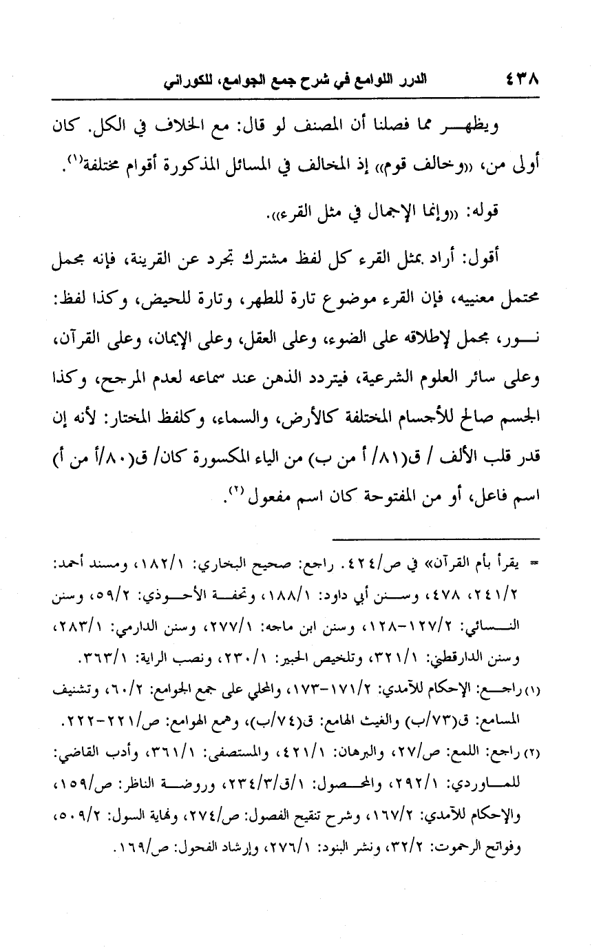 أقول: أراد بمثل القرء كل لفظ مشترك تجرد عن القرينة، فإنه مجمل محتمل معنييه، فإن القرء موضوع تارة للطهر، وتارة للحيض، وكذا لفظ: نور، مجمل لإطلاقه على الضوء، وعلى العقل، وعلى الإيمان، وعلى القرآن، وعلى سائر العلوم الشرعية، فيتردد الذهن عند سماعه لعدم المرجح، وكذا الجسم صالح للأجسام المختلفة كالأرض، والسماء، وكلفظ المختار: لأنه إن قدر قلب الألف/ ق (٨١/ أمن ب) من الياء المكسورة كان/ ق (٨٠/ أمن أ) اسم فاعل، أو من المفتوحة كان اسم مفعول (٢).