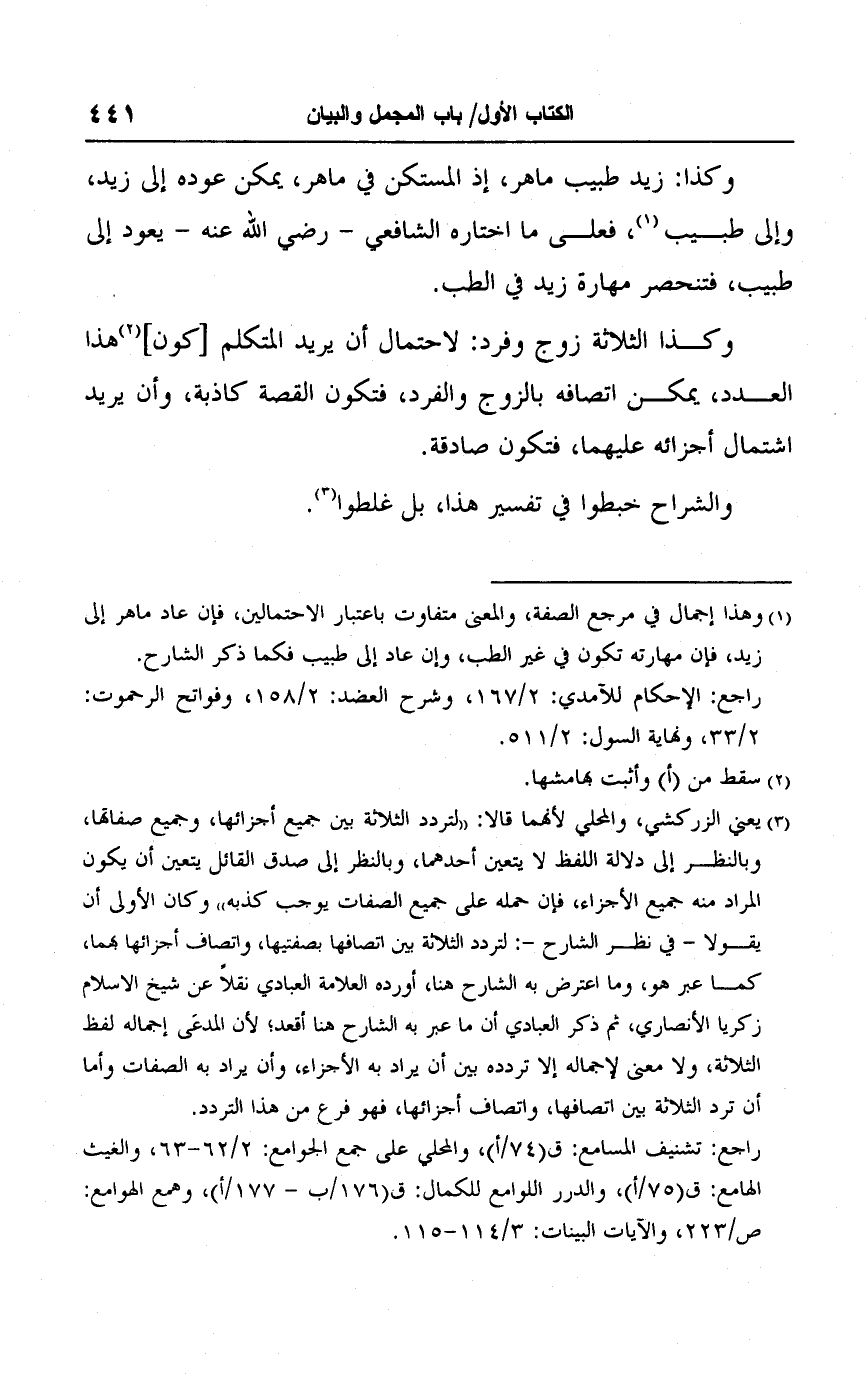 (٣) يعني الزركشي، والمحلي لأنهما قالا: "لتردد الثلاثة بين جميع أجزائها، وجميع صفاتها، وبالنظر إلى دلالة اللفظ لا يتعين أحدهما، وبالنظر إلى صدق القائل يتعين أن يكون المراد منه جميع الأجزاء، فإن حمله على جميع الصفات يوجب كذبه" وكان الأولى أن يقولا - في نظر الشارح -: لتردد الثلاثة بين اتصافها بصفتيها، واتصاف أجزائها بهما، كما عبر هو، وما اعترض به الشارح هنا، أورده العلامة العبادي نقلًا عن شيخ الإسلام زكريا الأنصاري، ثم ذكر العبادي أن ما عبر به الشارح هنا أقعد؛ لأن المدعَى إجماله لفظ الثلاثة، ولا معنى لإجماله إلا تردده بين أن يراد به الأجزاء، وأن يراد به الصفات وأما أن ترد الثلاثة بين اتصافها، واتصاف أجزائها، فهو فرع من هذا التردد.