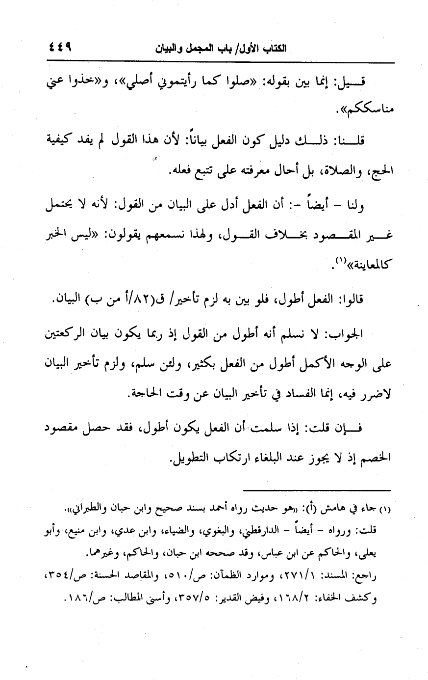الجواب: لا نسلم أنه أطول من القول إذ ربما يكون بيان الركعتين على الوجه الأكمل أطول من الفعل بكثير، ولئن سلم، ولزم تأخير البيان لا ضرر فيه، إنما الفساد في تأخير البيان عن وقت الحاجة.